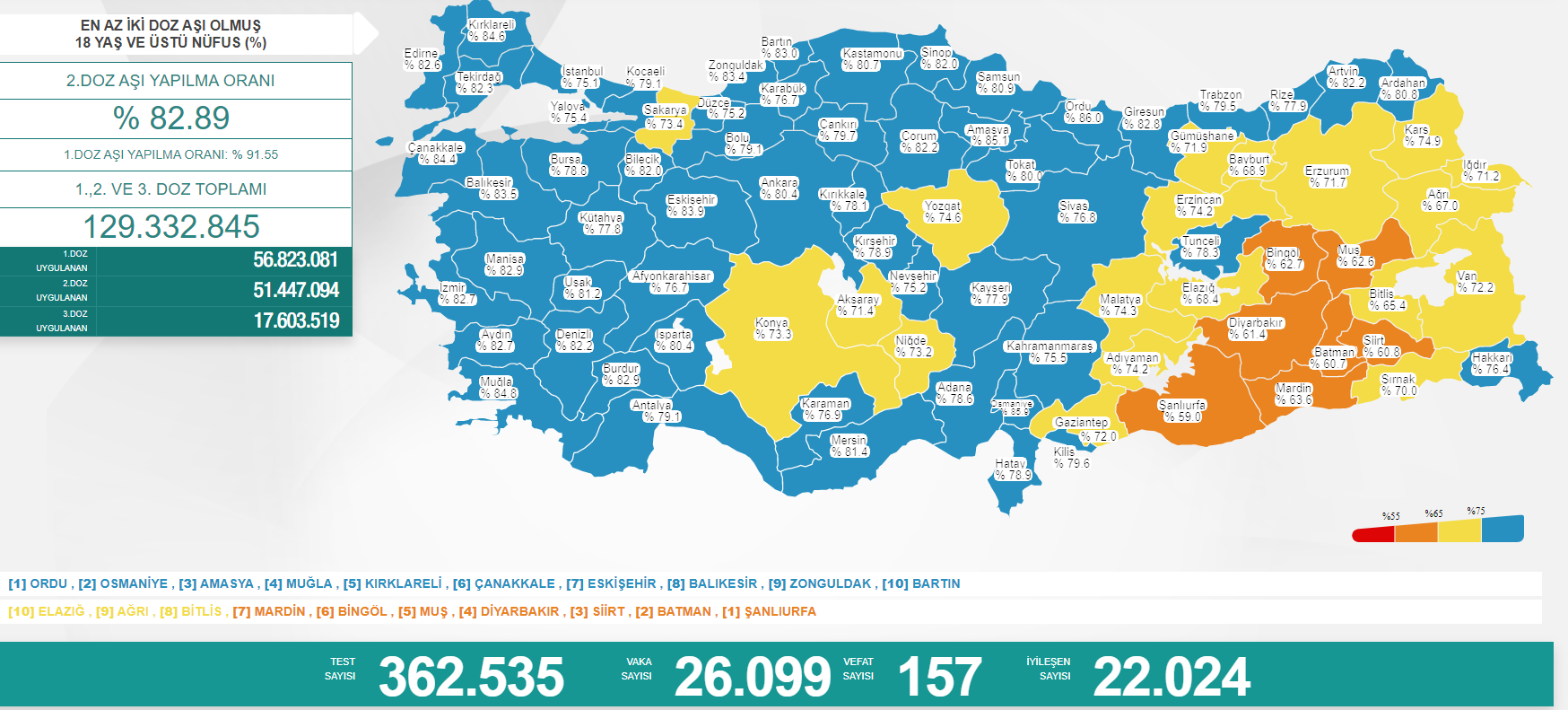 Sağlık Bakanlığı’nın günlük açıkladığı koronavirüs verilere göre son 24 saatte 362 bin 535 test yapıldı ve 26 bin 99 yeni vaka tespit edildi. 157 kişinin koronavirüs sebebiyle hayatını kaybettiği belirtildi.