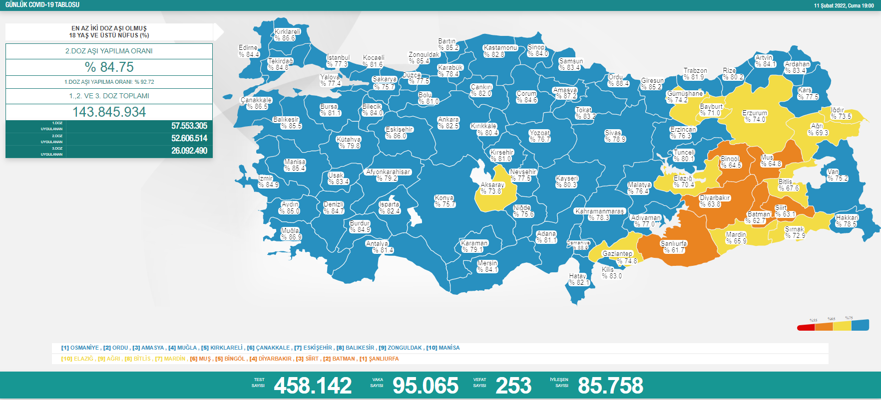 Sağlık Bakanlığı’nın günlük açıkladığı koronavirüs verilere göre son 24 saatte 458 bin 142 test yapıldı ve 95 bin 65 yeni vaka tespit edildi. 253 kişinin koronavirüs sebebiyle hayatını kaybettiği belirtildi.