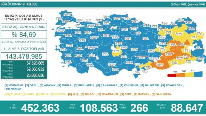 Sağlık Bakanlığı’nın günlük açıkladığı koronavirüs verilere göre son 24 saatte 452 bin 363 test yapıldı ve 108 bin 563 yeni vaka tespit edildi. 266 kişinin koronavirüs sebebiyle hayatını kaybettiği belirtildi.