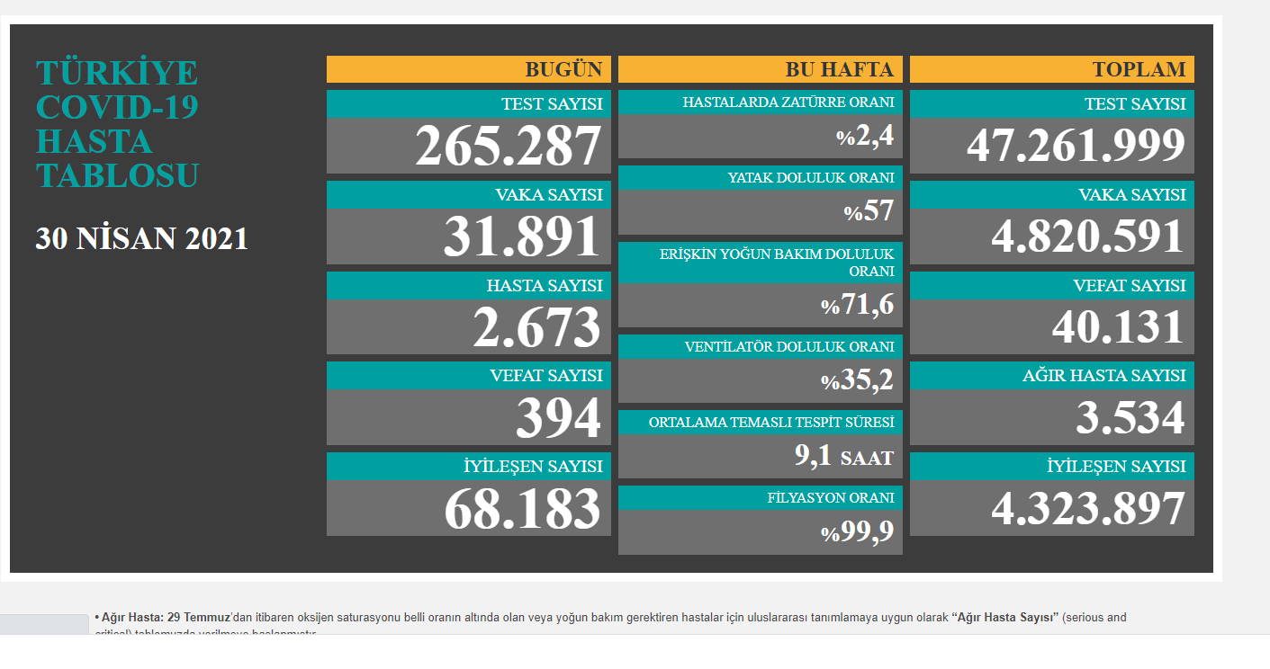 Sağlık Bakanlığı, Koronavirüs (Covid-19) günlük hasta tablosunu paylaştı. Verilere göre, Türkiye’de koronavirüs nedeniyle son 24 saatte 394 kişi daha hayatını kaybetti, 2 bin 673 yeni hasta dahil olmak üzere 31 bin 891 yeni vaka tespit edildi.