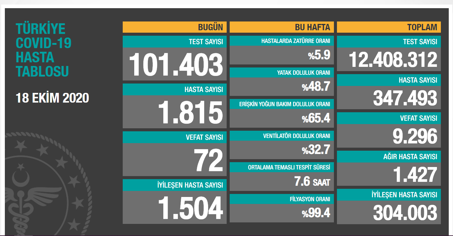 Türkiye’de koronavirüs nedeniyle 72 yurttaş daha hayatını kaybetti, bin 815 yeni hasta tespit edildi. Böylece toplam vefat sayısı 9 bin 296’ya, hasta sayısı ise 347 bin 493’e yükseldi. Ağır hasta sayısı bin 427 olarak açıklanırken, iyileşen sayısı bin 504 oldu. Bugünkü test sayısı 101 bin 403 olurken, toplam iyileşen sayısı 304 bin 3’e yükseldi.