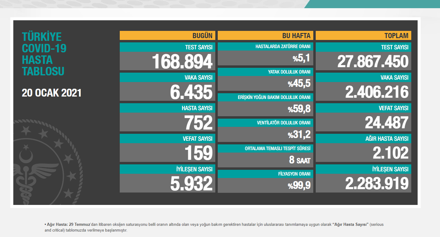 Tabloya göre Türkiye’de Koronavirüs nedeniyle 159 kişi daha hayatını kaybetti, 6 bin 435 yeni vaka tespit edildi. Böylece pandemiden dolayı yaşamını yitiren toplam kişi sayısı 24 bin 487’ye, vaka sayısı ise 2 milyon 406 bin 216’ya yükseldi. Tabloda son 24 saatte 5 bin 932 kişinin iyileştiği paylaşılırken, toplam iyileşen sayısı 2 milyon 283 bin 919 olarak açıklandı.