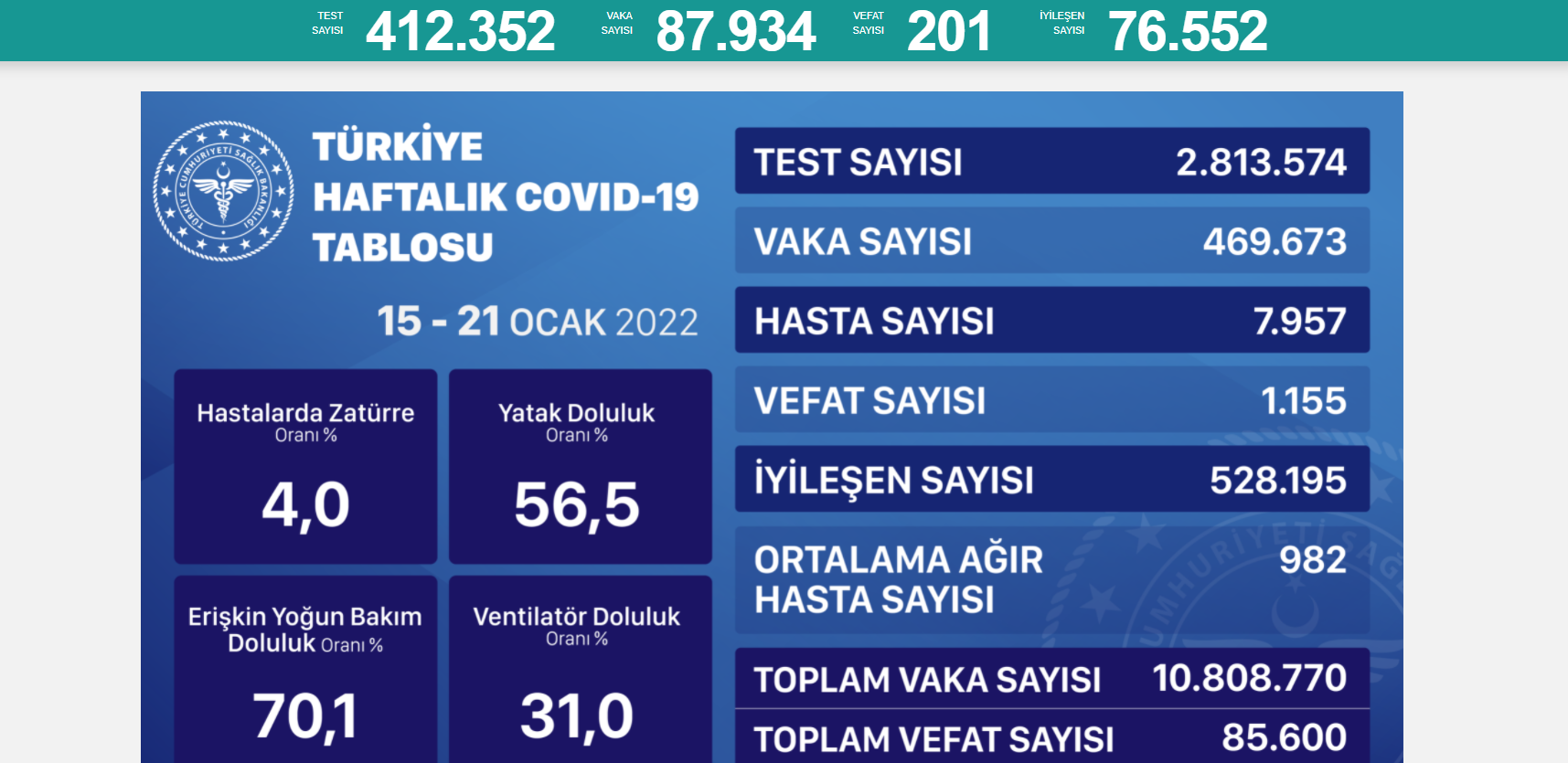 Sağlık Bakanlığı, günlük koronavirüs verilerini açıkladı. Son 24 saatte 412 bin 552 test yapıldı ve 87 bin 934 yeni vaka tespit edildi. 201 kişinin koronavirüs sebebiyle hayatını kaybettiği belirtildi.