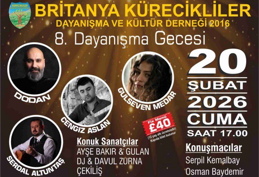 Birleşik Krallık’ta yaşayan Kürecikliler göç koşullarında kimlik, aidiyet ve kültürel sürekliliği büyütmek amacıyla 20 Şubat 2026 Cuma günü Londra’da bir araya gelecek. Britanya Kürecikliler Dayanışma ve Kültür Derneği tarafından düzenlenecek 8. Dayanışma Gecesi, Edmonton bölgesinde bulunan Kervan Düğün Salonu’nda yapılacak. Saat 17.00’de başlayacak etkinlik, diasporada yaşayan Kürecikliler açısından yalnızca bir kültür buluşması değil; ortak hafızanın korunması ve gelecek kuşaklara aktarılması açısından da önemli bir adım olarak görülüyor.