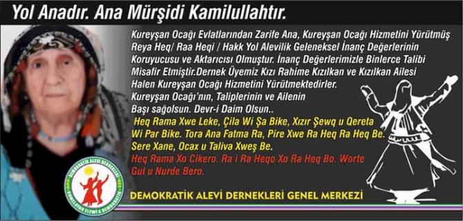 Demokratik Alevi Derneği (DAD) Genel Merkezi Zarife Ana için başsağlığı mesajı yayınladı.