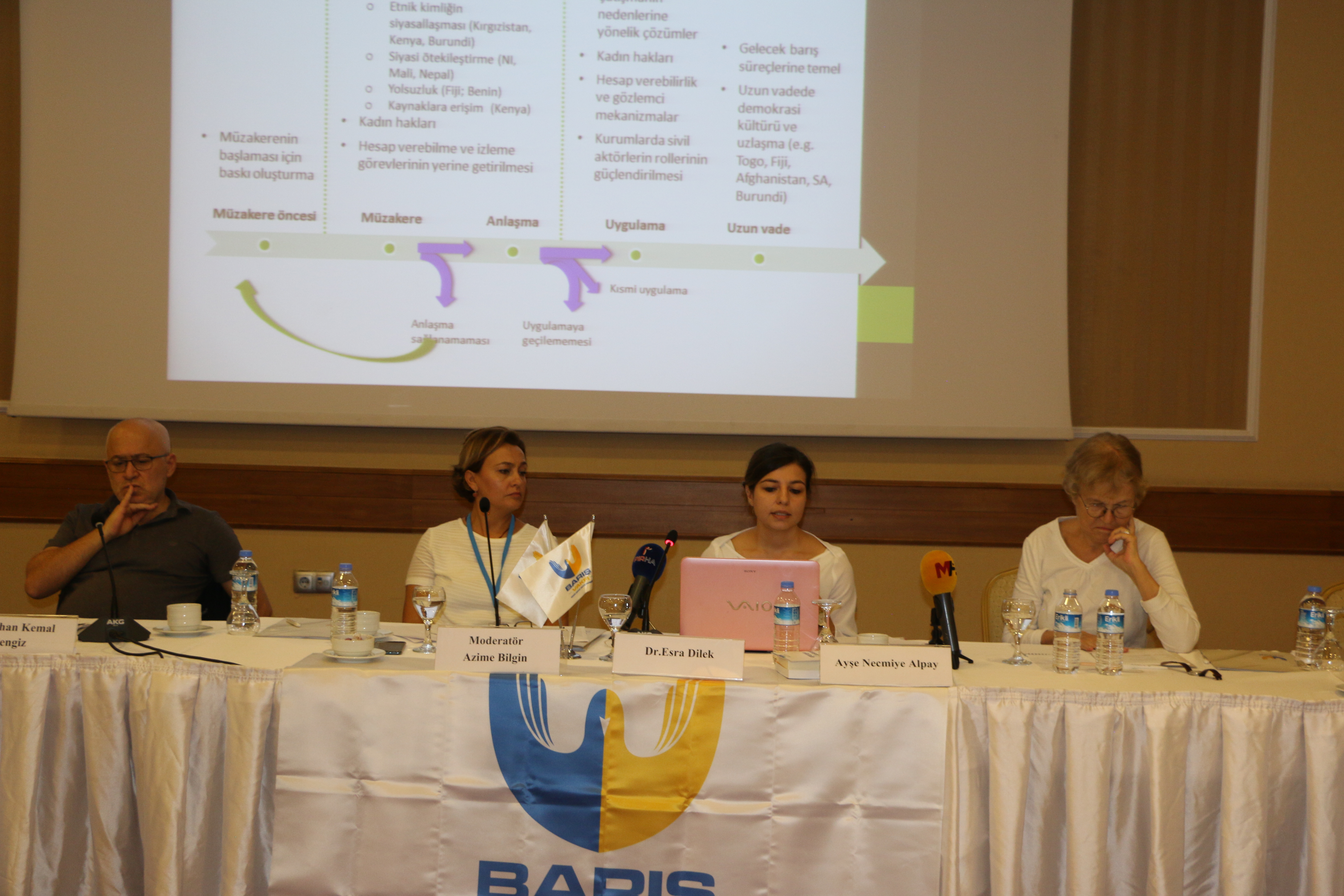 “Bugün savaşa ‘savaş’ demenin suç olduğu bir süreç yaşıyoruz. Bu süreçte bir taraftan da barış fikrini büyütmeye çalışıyoruz. ‘Kürt sorunun diyalog masasının kurulması nasıl olur?’ tartışmasından çok bu ortamda çatışma çözümü çalışan STK’ların barış fikrini güçlendirmek için ne yapabilir? sorusuna cevap arıyoruz. Biz şuna inanıyoruz: Toplumda büyük bir öteki kılma ve ‘vatan elden gidiyor’ duygusunun hakim olduğu bütün siyasetin ağırlıklı kısmının böyle dizildiği bir süreç yaşıyoruz. Devletin Suriye’de izlediği politikaya içerden siyaseten çok büyük bir desteğin olduğu ya da ses çıkılamaz bir durumda olduğunu görüyoruz. Savaşa savaş döneminde ‘hayır’ denilemediği zaman barış sürecinde etkili olamazsınız. Bizim bu yaptığımız işin bir kıymeti vardır. Eninde sonunda biz masaya geleceğiz. Oraya toplumu hazırlamamız gerekir. İnsanların masaya olan ihtiyacını dillendirmemiz gerekir”