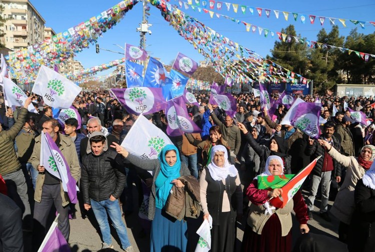 HDP cezaevlerinde süren açlık grevlerine dikkat çekmek amacıyla “Demokrasi, Özgürlük ve Adalet” sloganıyla Diyarbakır İstasyon Meydanı’nda bir miting düzenledi.