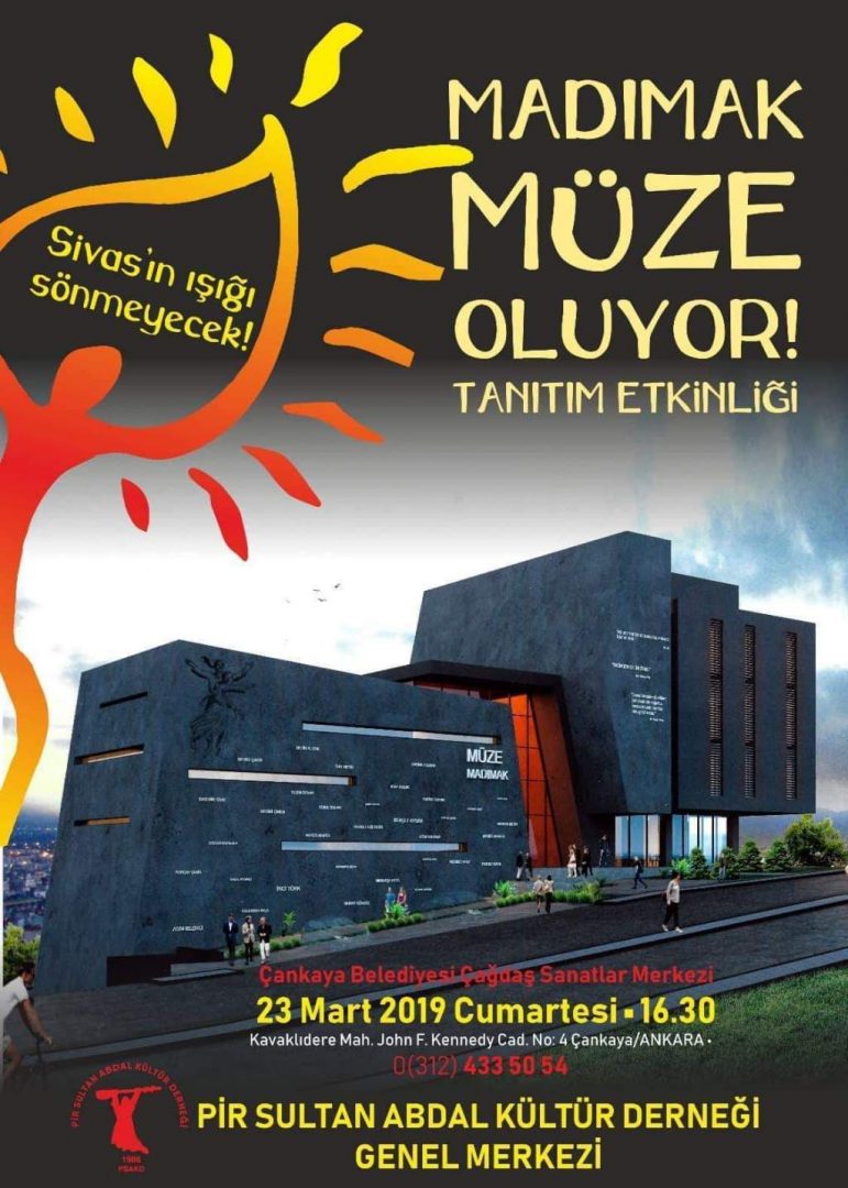 Pir Sultan Abdal Kültür Derneği Genel Merkezi’nden yapılan yazılı açıklama ile ‘Madımak Müze oluyor’ projesi kapsamında tanıtım etkinliği düzenleneceği duyuruldu. 23 Mart Cumartesi günü 16.30’da yapılacak etkinliğin adresi ise Çankaya Belediyesi Çağdaş Sanatlar Merkezi olacak.