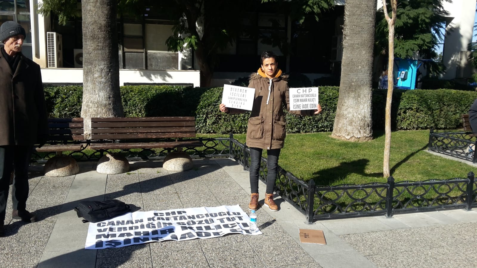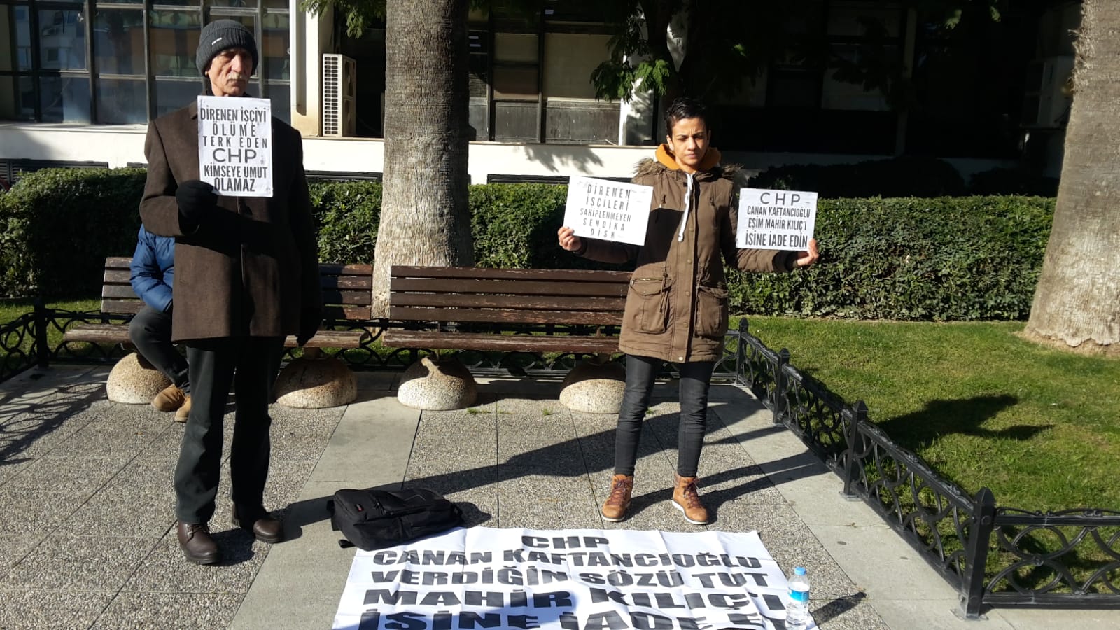 “CHP-Canan Kaftancıoğlu verdiğin sözü tut, Mahir Kılıç’ı işine iade et” pankartının açıldığı eylemde, yine “Direnen işçiyi ölüme terk eden CHP kimseye umut olamaz”, “Direnen işçileri sahiplenmeyen DİSK” dövizleri taşındı.