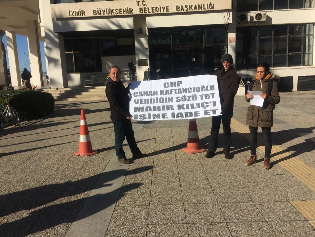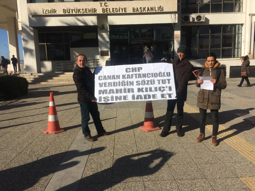 CHP’li belediyelerden haksız bir şekilde işlerinden atılan ve direnişte olan işçiler olduğunu belirten Kılıç, direnen isçilerden birisinin de eşi Mahir Kılıç olduğunu hatırlattı. Kılıç, eşinin ekmeği için 140 gündür açlık grevinde olduğuna vurgu yaparak, “CHP’ye karşı işi, ekmeği için direnen tüm işçiler işçi düşmanlarından hesap soracak. Eşim Mahir Kılıç işi, ekmeği için direniyor. İzmir Büyükşehir Belediyesi’nin kendisini haksız bir şekilde kadro davası açtığı için 258 iş arkadaşı ile beraber isten atmasından sonra belediye önünde direnişe başlamıştı. Karşıyaka Belediyesi ile yapılan protokol sonucu direnişi bırakmışlar , aradan geçen aylara rağmen ise işlerine başlatılmadılar. Bunun üzerine esim bu kez Ankara CHP Genel Merkezi önünde direnişe başladı. Burada da İstanbul İl Başkanı Canan Kaftancıoglu ile yaptığı görüşme sonrası bir protokol yapıldı. Bu maddelere uyulmayınca eşim tekrardan direniş kararı aldı ve protokolde imzacı olan ve eşime bunun için söz veren Canan Kaftancıoğlu’nun başkanlığını yaptığı İstanbul İl Başkanlığı önünde direnişe başladı” diye konuştu.