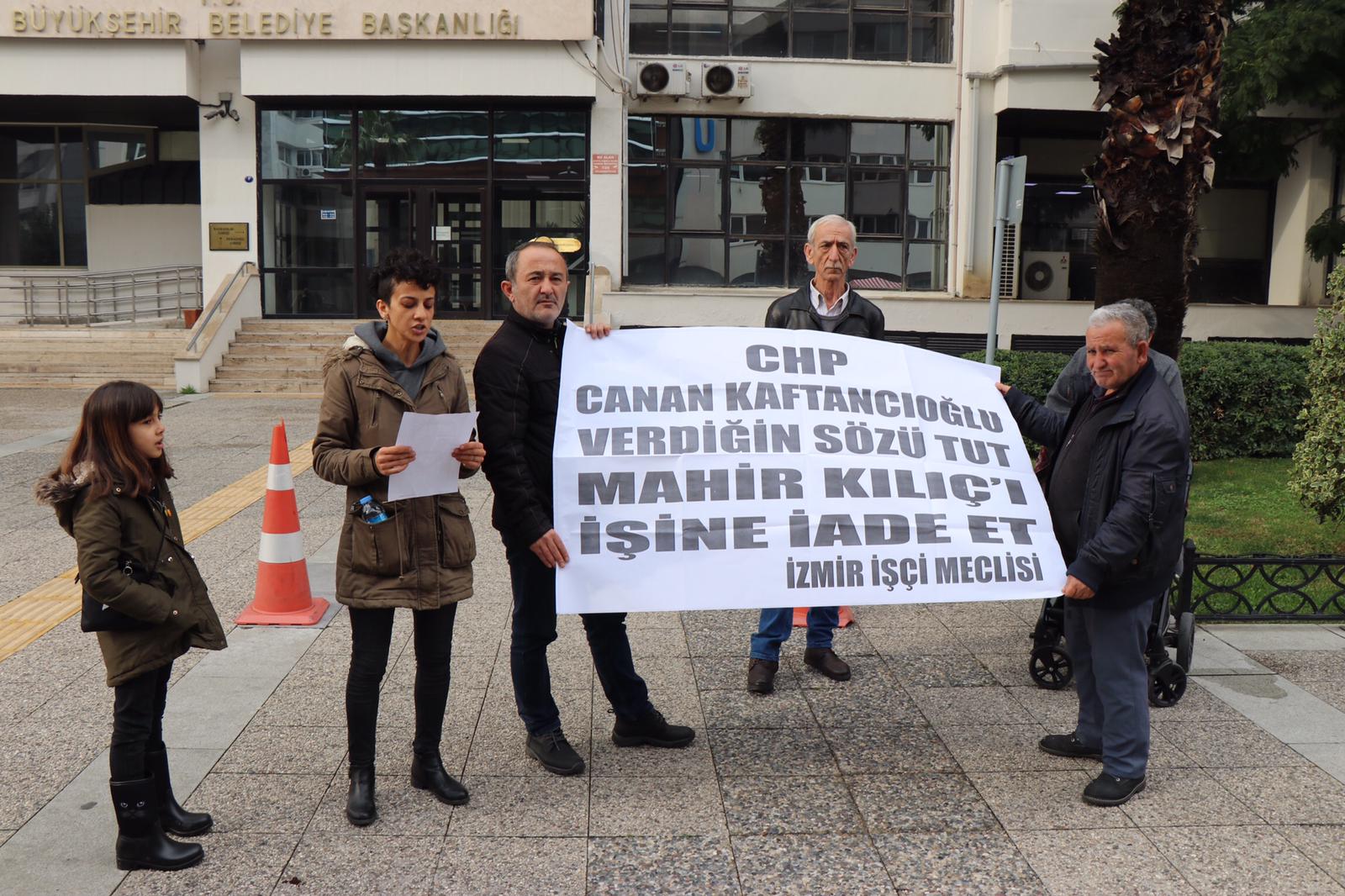 Konuya ilişkin İzmir Büyükşehir Belediyesi önünde basın açıklaması gerçekleştiren Mahir Kılıç’ın eşi Aylin Kılıç, çeşitli kurumların imzalarının olduğu işe geri dönüş protokolüne rağmen CHP’nin sözünü tutmadığını vurguladı. CHP İstanbul İl Başkanı Canan Kaftancıoğlu’nun sorunu çözeceğine dair sözünü hatırlatan Kılıç, Kaftancıoğlu’nun sözünü unutarak 124 gündür il binası önünde açlık grevinde olan Mahir Kılıç’ı görmezden geldiğini ifade etti.