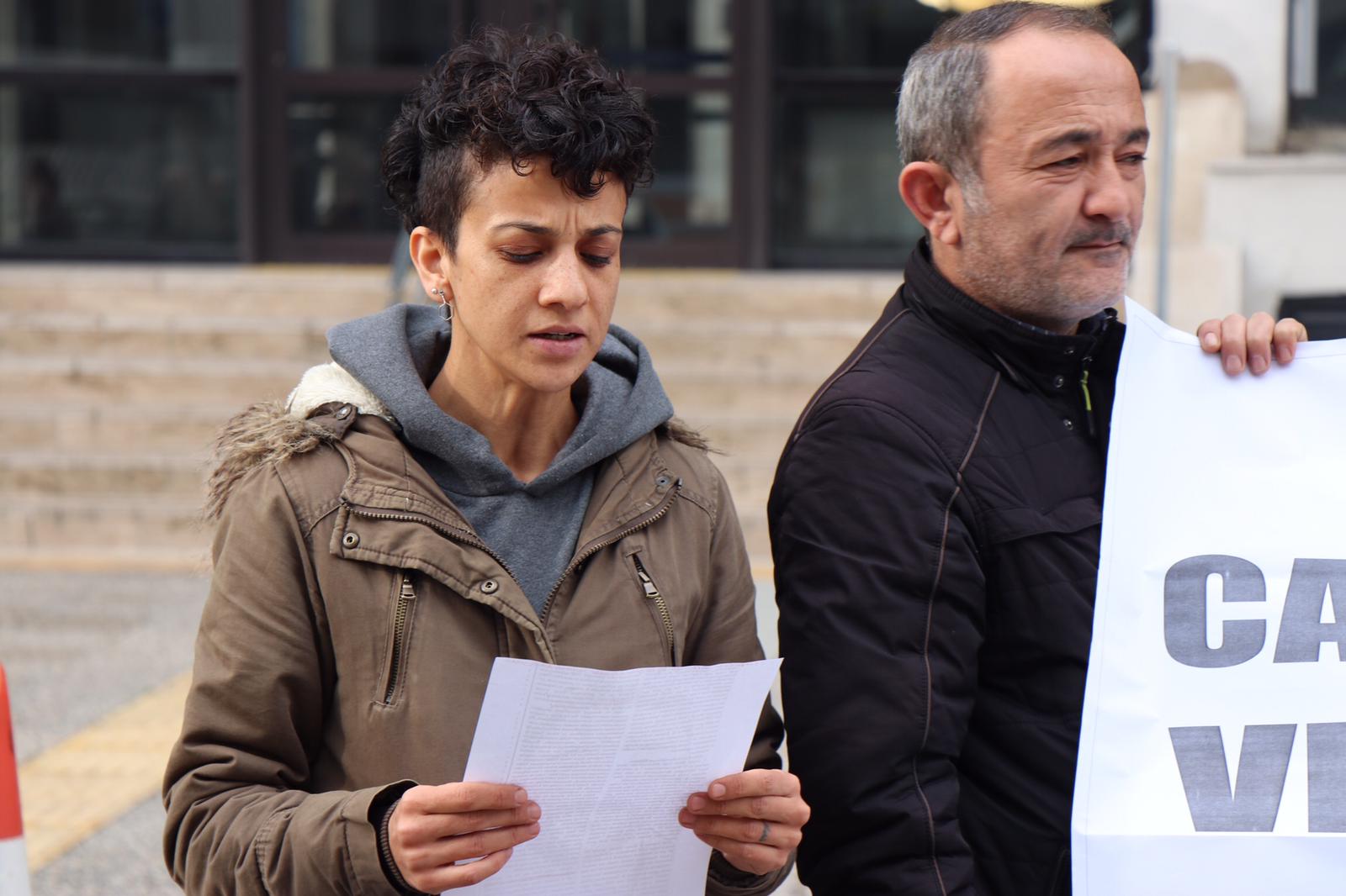 PİRHA- İzmir Büyükşehir Belediyesi’nden işten çıkarılan ve CHP İstanbul İl Binası önünde 124 gündür süresiz açlık grevinde olan Mahir Kılıç’ın eşi Aylin Kılıç, belediye önünde açıklama yaparak, “Meydanlarda, gazetelerde, televizyon demeçlerinde insan hakları, hukuk, adalet üzerine nutuk atan CHP, kendi kapısı önünde eriyen bir işçiyi görmezden geliyor”dedi.