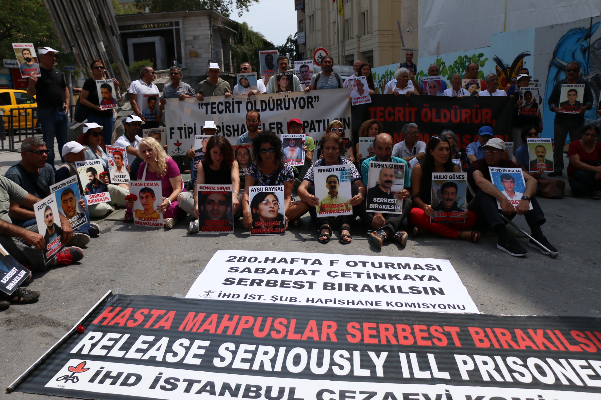 İHD İstanbul Şubesi Hapishane Komisyonu’nun düzenlediği F oturumunun 280. haftasında hapishanelerdeki hasta tutukluların durumu anlatılmaya devam edildi. “F tipi hapishaneler kapatılsın”, “Tecrit öldürür dayanışma yaşatır”, “Hasta mahpuslar serbest bırakılsın” pankartların açıldığı eylemde “Sabahat Çetinkaya serbest bırakılsın”, “İHMAL işkencesi ne son”, “İnsanlık onuru işkenceyi yenecek” sloganları atıldı.