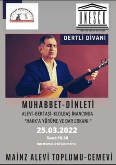PİRHA – Almanya’nın Mainz kentinde yaşayan Aleviler, “Hakk’a yürüme ve dar erkanı” başlıklı muhabbet yapacak. 25 Mart’ta yapılacak buluşmada Dertli Divani de dinleti sunacak.