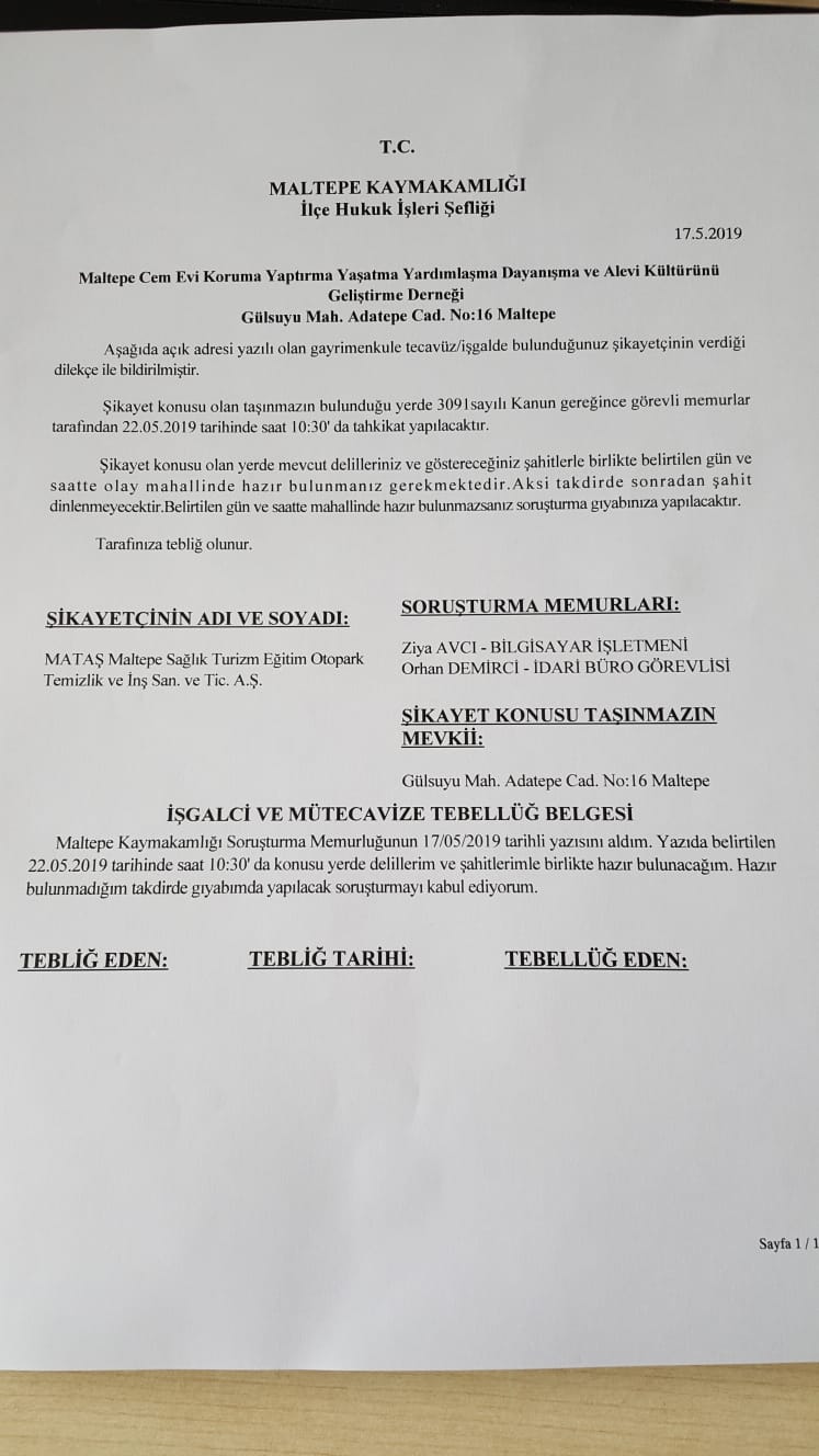 Maltepe Kaymakamlığı tarafından cemevine gönderilen tebligatta, 22 Mayıs Çarşamba günü saat 10.30’da polis tarafından cemevinde tahkikat yapılacağı belirtildi.