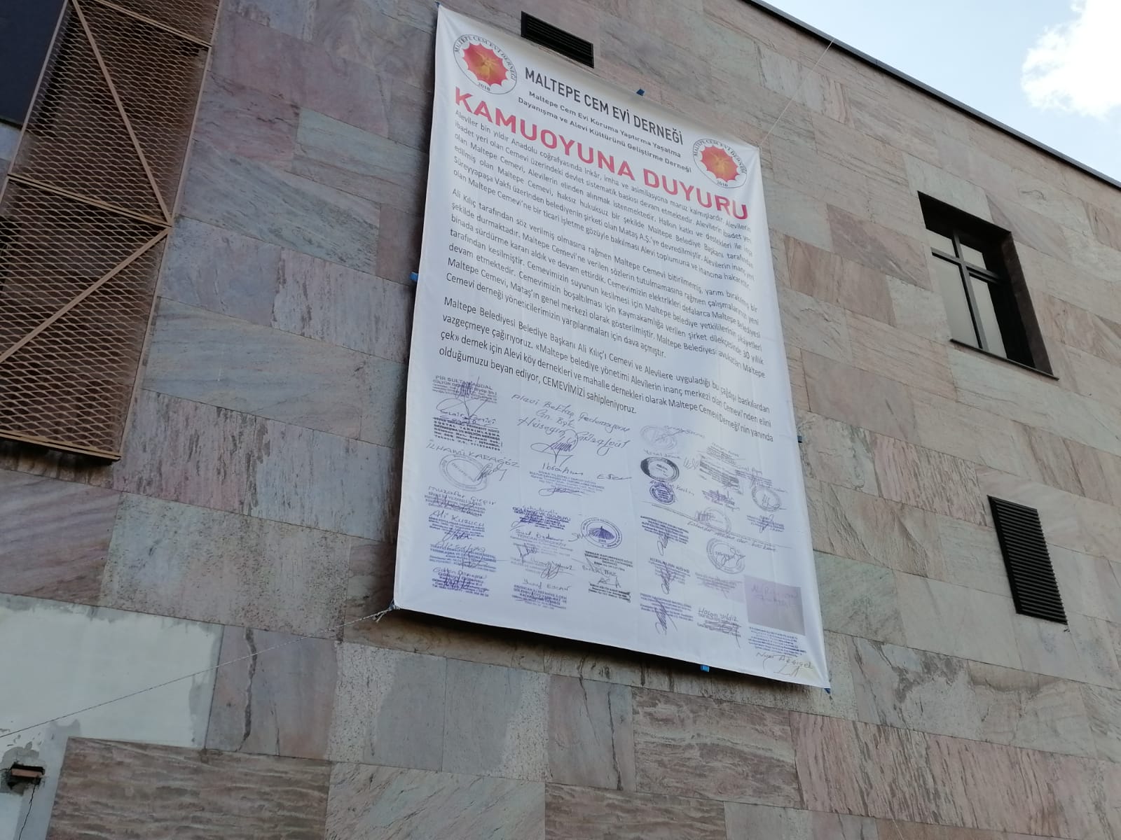 Son olarak kamuoyunu bilgilendirme amacıyla yöre dernekleri ile kaleme aldığımız ve imzaladığımız deklarasyona ait büyük pankartları almak üzere 29 Ekim Cumhuriyet Bayramı akşamı saat 21.05’de cemevi kapı kilitleri kırılarak vinç yardımıyla pankartlarımız yerlerinden sökülerek alınmıştır. Bu saldırı kabul edilemez. Maltepe Belediye yönetimi imar planlarında olduğu gibi cemevi meselesini de gerçeklerin kamuoyu tarafından bilinmesini istememektedir. Ali Kılıç bu çağdışı ve barbarca tutumundan vazgeçmelidir.