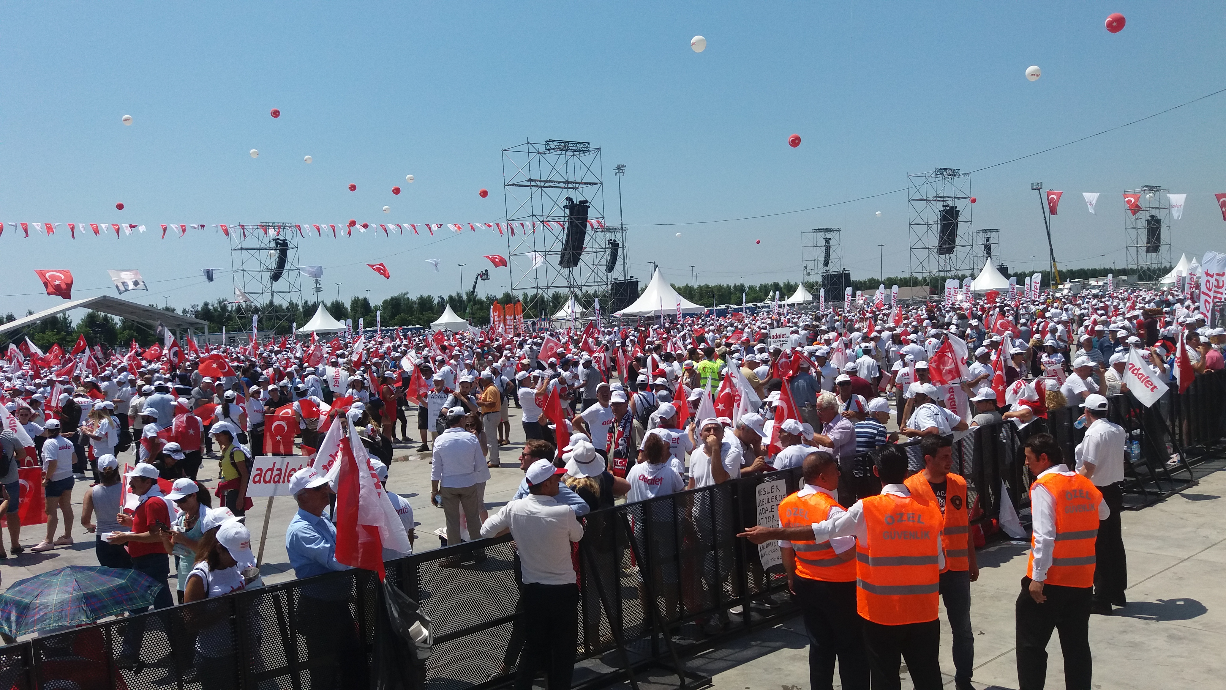 Henüz erken saatler olmasına ve sıcak havaya rağmen alanın etrafında halk yoğunlaşmaya başladı. Etrafımızdaki insanlara bugünki mitinge ne kadar bir katılım beklediklerini sorduğumuzda aldığımız cevap milyonlar oluyor.