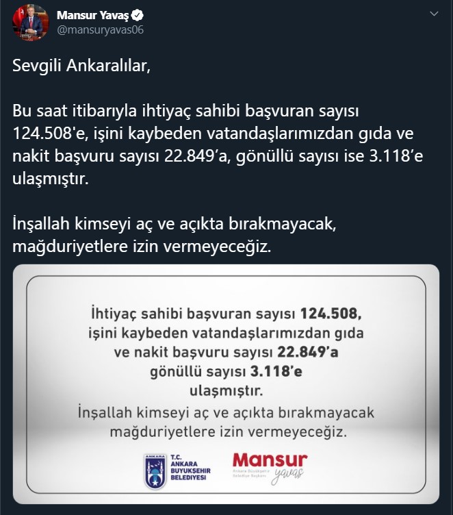 Yapılan başvurularla ilgili sosyal medyadan açıklamada bulunan Yavaş, ”Bu saat itibarıyla ihtiyaç sahibi başvuran sayısı 124.508’e, işini kaybeden vatandaşlarımızdan gıda ve nakit başvuru sayısı 22.849’a, gönüllü sayısı ise 3.118’e ulaşmıştır. İnşallah kimseyi aç ve açıkta bırakmayacak, mağduriyetlere izin vermeyeceğiz” dedi.