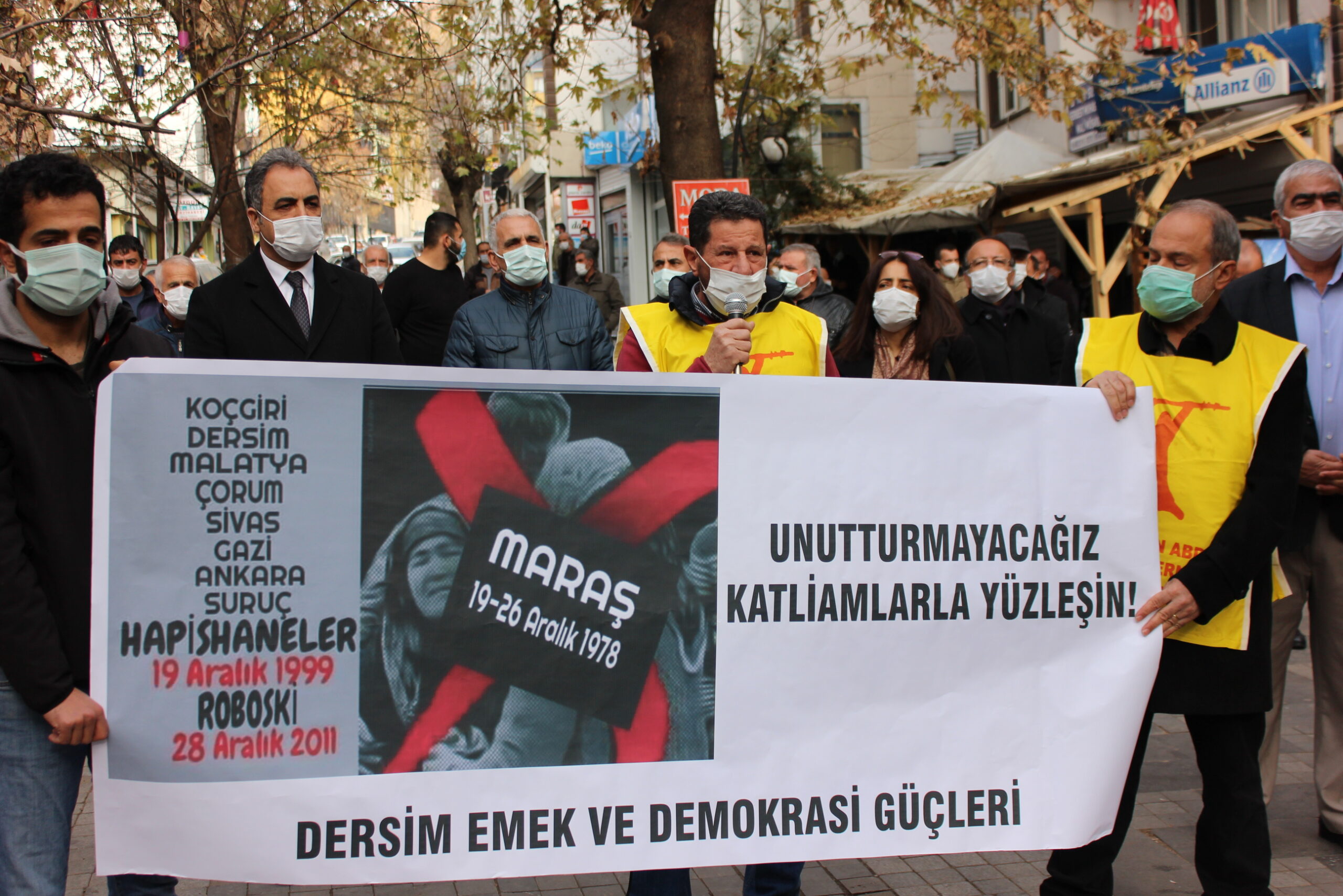 PİRHA-Dersim Emek ve Demokrasi Güçleri, Dersim’de sanat sokağında bir araya gelerek Maraş Katliamı’nın 42. yılında basın açıklaması yaptı. Açıklamayı okuyan Pir Sultan Abdal Kültür Derneği Dersim Şube Başkanı Ekber Kaya Maraş Katliamı’nın basit bir Alevi-Sünni düşmanlığı ile açıklanamayacak kadar alçakça yapıldığını vurguladı.