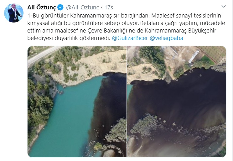 “Bu görüntüler Kahramanmaraş Sır Barajı’ndan. Maalesef sanayi tesislerinin kimyasal atığı bu görüntülere sebep oluyor. Defalarca çağrı yaptım, mücadele ettim ama maalesef ne Çevre Bakanlığı ne de Kahramanmaraş Büyükşehir Belediyesi duyarlılık göstermedi.