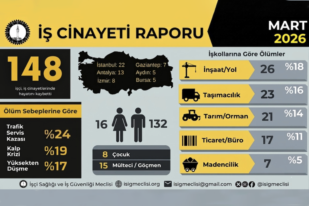 PİRHA- İSİG Meclisi’nin Mart 2026 raporuna göre Türkiye’de en az 148 işçi yaşamını yitirdi. Raporda iş cinayetlerinin en çok inşaat, taşımacılık ve tarım işkollarında yoğunlaştığı belirtildi.