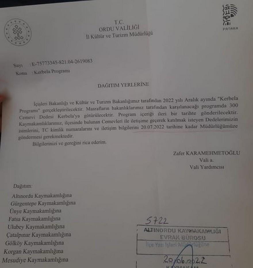 İçişleri, Gençlik ve Spor ile Kültür ve Turizm bakanlıkları tarafından 19-23 Ağustos 2022 tarihlerinde düzenleneceği duyurulan “Hacıbektaş Gençlik Kampı”nın ardından “Kerbela” programının da yapılacağı öğrenildi. İçişleri Bakanlığı ile Kültür ve Turizm Bakanlığı tarafından 2022 Aralık ayında planlanan “Kerbela programı” kapsamında 300 cemevi dedesinin Kerbela’ya götürüleceği belirtildi. Masraflarının bakanlıklar tarafından karşılanacağı açıklanan programın içeriğinin yakın zamanda bildirileceği ifade edilirken, konuya ilişkin valilikler tarafından kaymakamlıklara yazıların gönderildiği öğrenildi. Cemevleri ile iletişime geçilerek programa katılmak isteyen dedelerin 20 Temmuz 2022 tarihine kadar isimlerini bildirmeleri istendi.