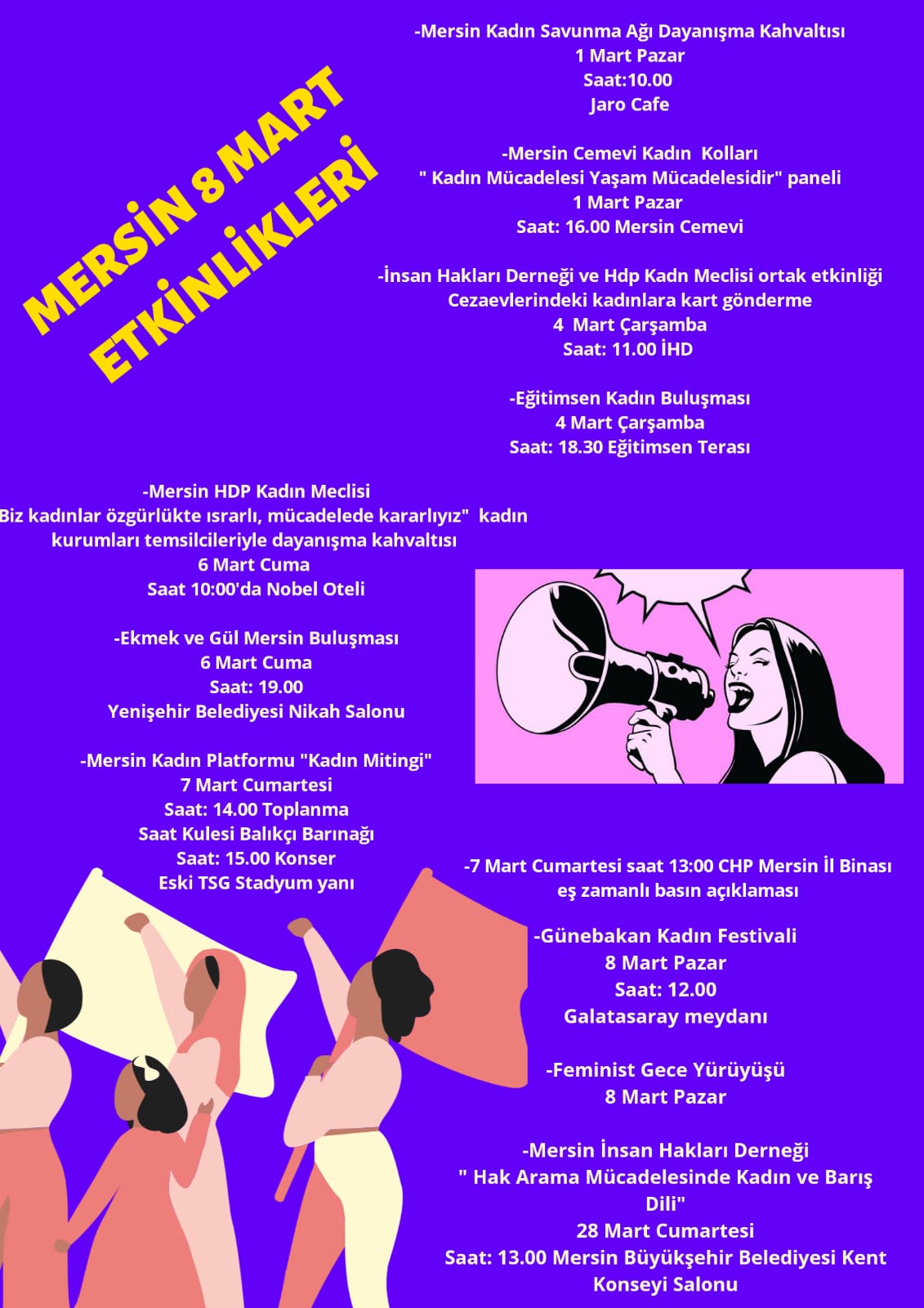 - “1 Mart: Mersin Kadın Savunma Ağı tarafından dayanışma kahvaltısı ve Mersin Cemevi Kadın Kolları “Kadın mücadelesi yaşam mücadelesidir” başlıklı panel düzenlenecek.