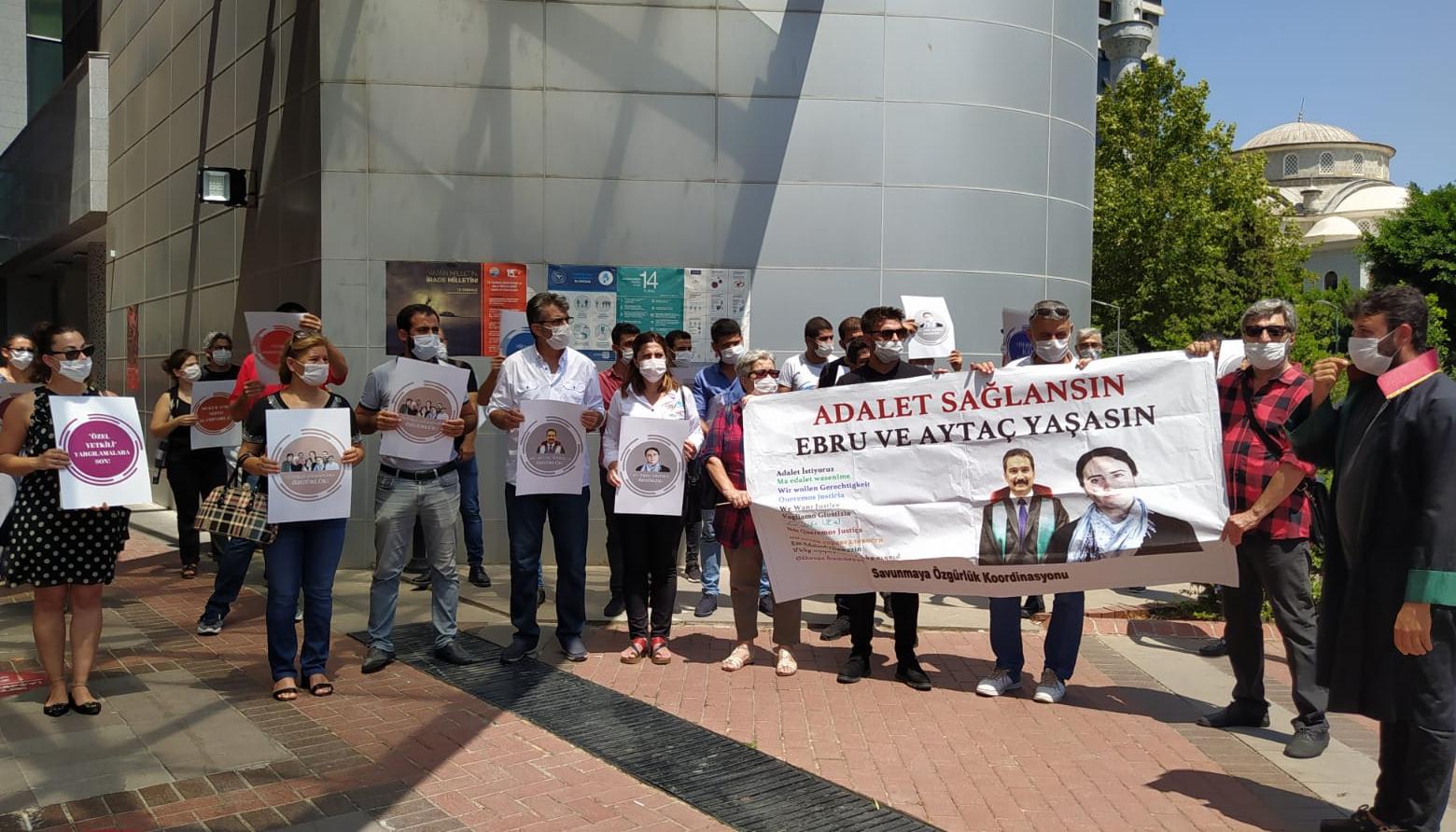 ÇHD Mersin Şube Başkanı Mehmet Altuntaş, Timtik ve Ünsal’In sadece adalet istediklerini belirterek, “Ebru ve Aytaç bir bütün toplumun adalet arayışını temsil ediyorlar. Bizler de bu talebe sahip çıkmak için buradayız. İstediğimiz şey sadece ve sadece Adli Tıp Kurumu’nun kararının uygulanması ve meslektaşlarımızın serbest bırakılmasıdır. Herkesi de duyarlı olmaya davet ediyorum” dedi.