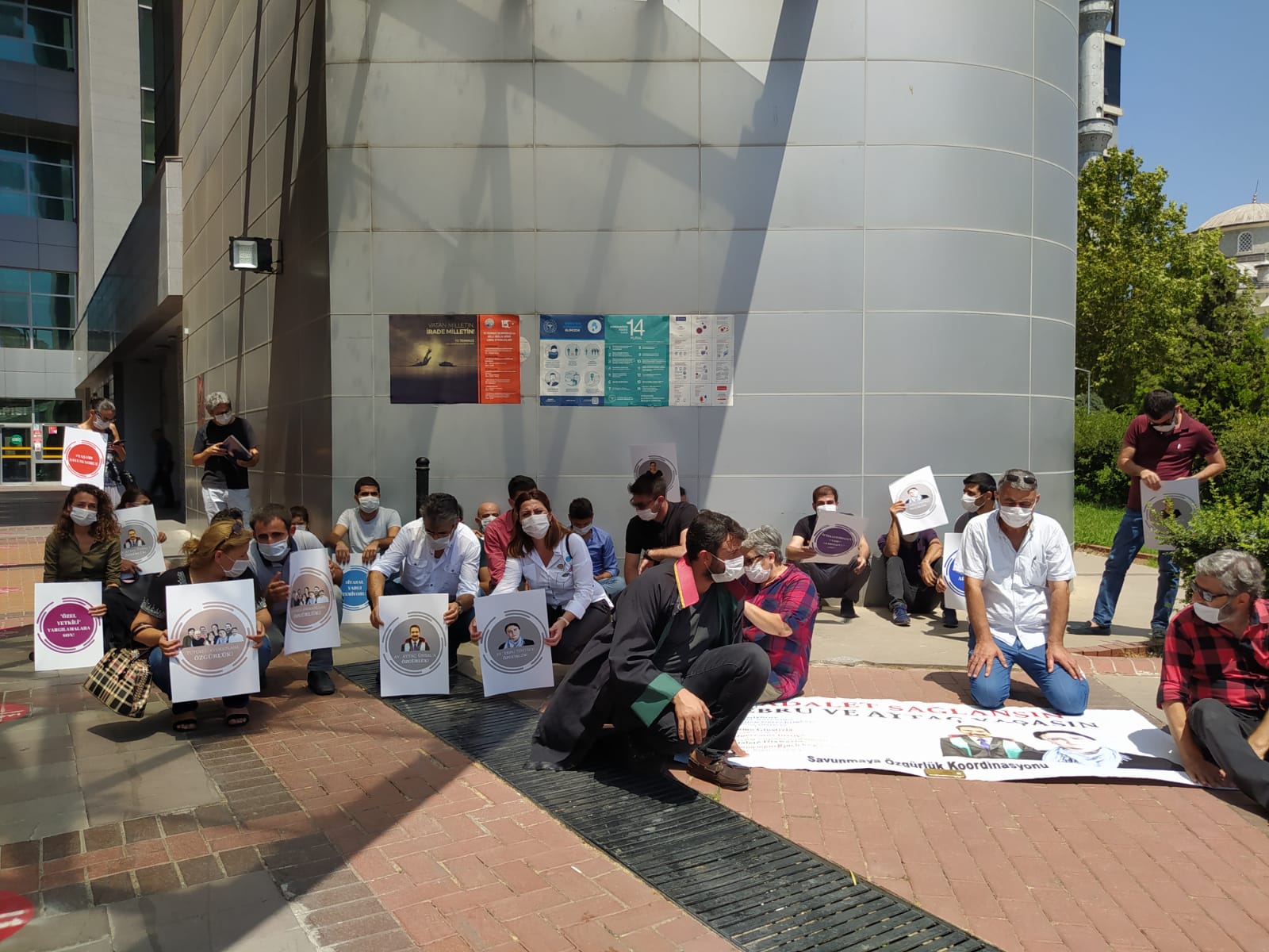 Timtik ve Ünsal’ın eylemine dikkat çekmek ve “adil yargılanma” taleplerinin kabul edilmesini isteyen Özgürlükçü Hukukçular Dermeği (ÖHD) ve Çağdaş Hukukçular Derneği (ÇHD) üyesi avukatlar Mersin Adliyesi önünde bir araya gelmeye devam ediyor.
