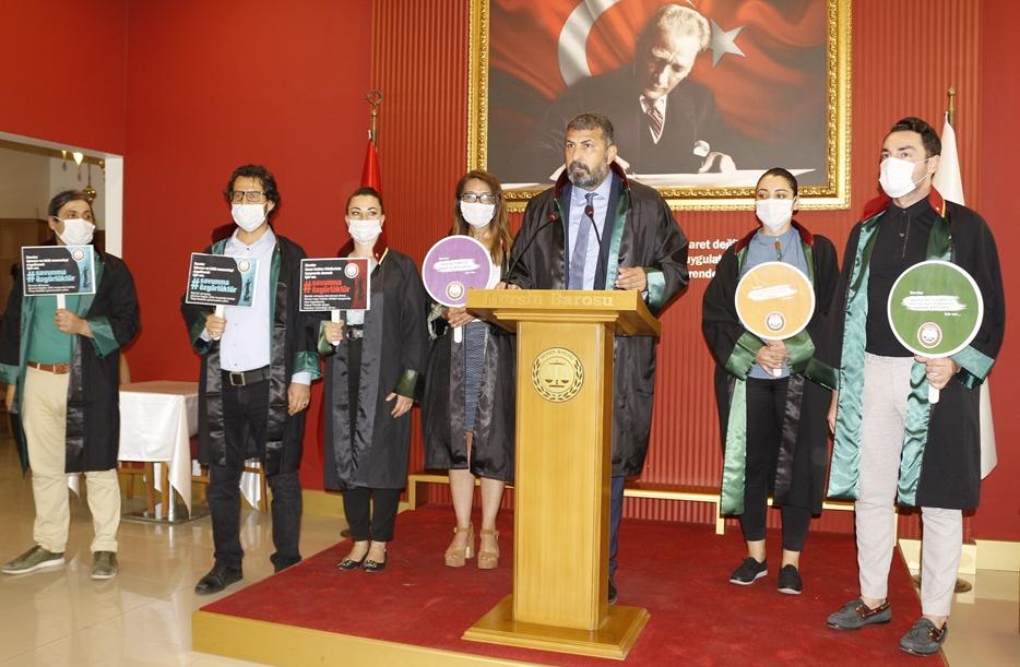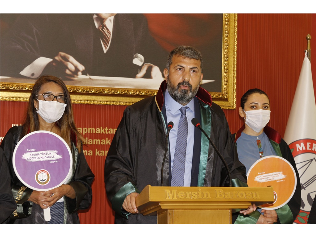 Mersin Barosu Başkanı Av. Bilgin Yeşilboğaz, siyasi iradenin Avukatlık Kanunu değişikliği, çoklu baro ve nispi temsil sistemi girişimine karşı baroda basın açıklaması yaptı.