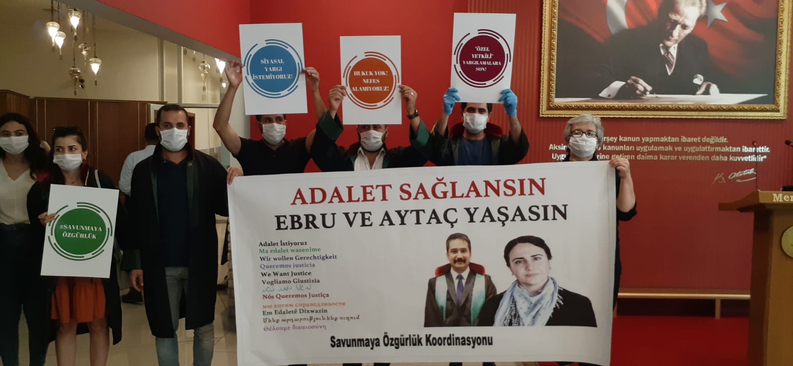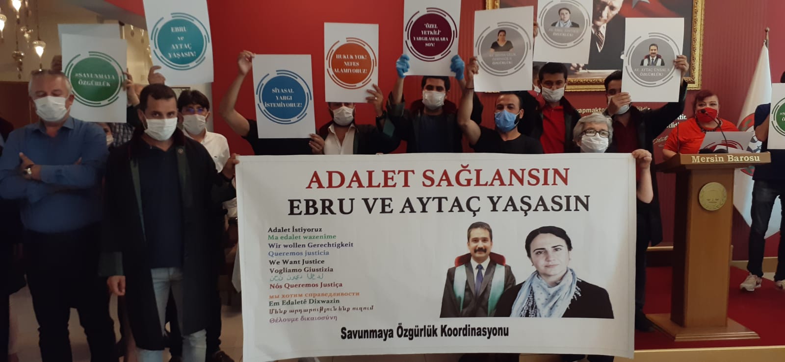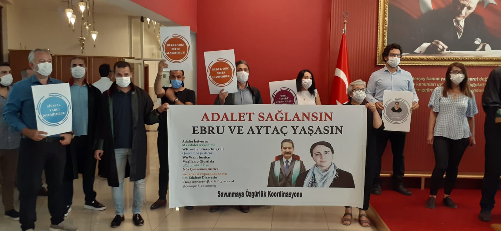 “Bugün Ebru ve Aytaç’ın da içinde olduğu 18 avukatın yargılandığı bu dava Yargıtay incelemesi aşamasındadır. Bunun anlamı, çok kısa bir süre içerisinde doğrudan talimatla hareket ettiği şüphe götürmeyen İstanbul 37’inci Ağır Ceza Mahkemesi’nin kurduğu hüküm hakkında bir karar verileceğidir. Bizler de hukukçular ve insan hakları savunucuları olarak bu kaygıyı ve isyanı paylaşıyor ve aynı talebi bir kez de bugün dile getirme sorumluluğunu duyuyoruz! Bahsi geçen dosya kapsamındaki hukuka aykırılıklar açık olup, bütün dünyaca bilinmektedir. Bu haliyle hukuka aykırılıkların tespitiyle, adil yargılamanın tesisine ilişkin şartlar derhal yaratılmalı, tutuklu avukatlar bir an önce serbest bırakılmalıdır. Adil yargılanma haktır. Adalet sağlansın. Ebru ve Aytaç yaşasın.”