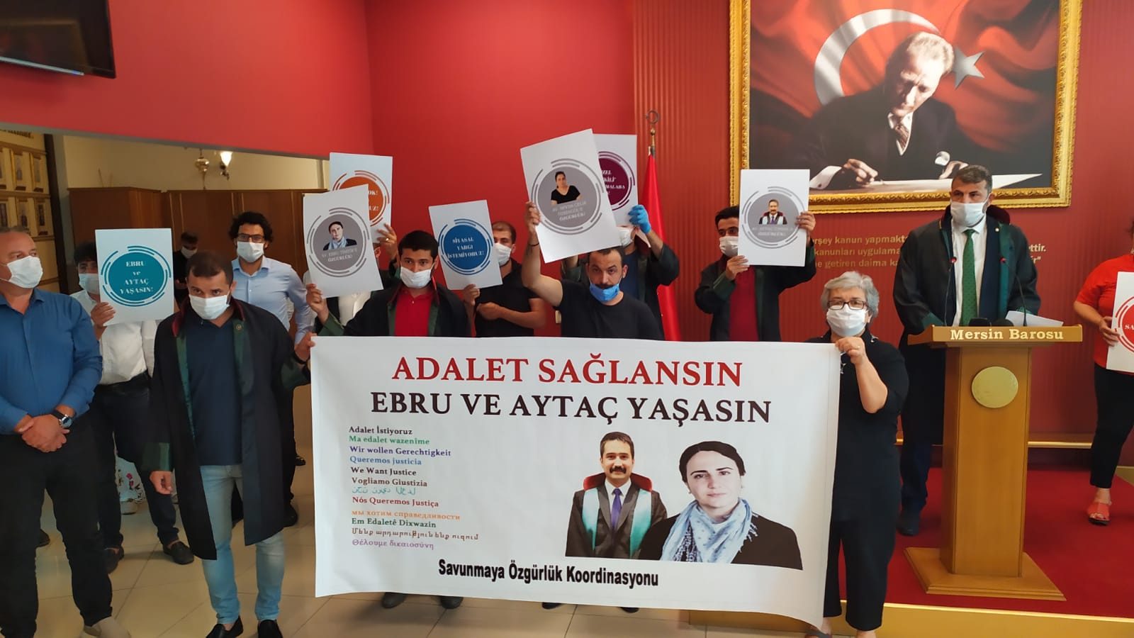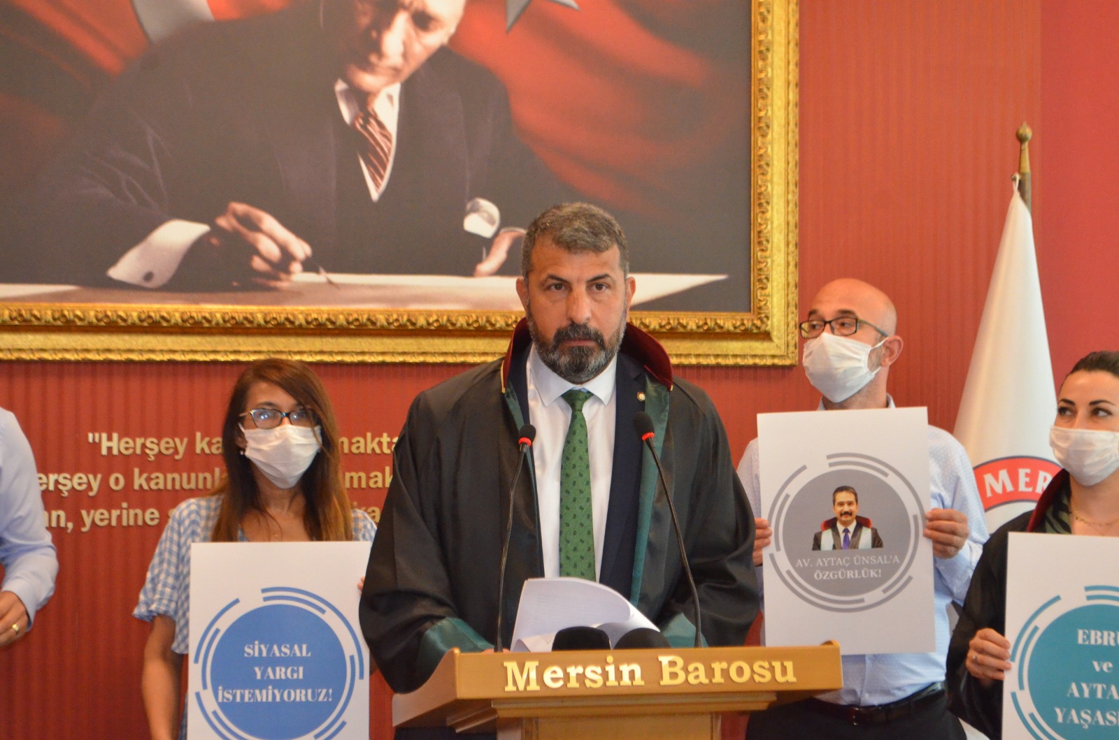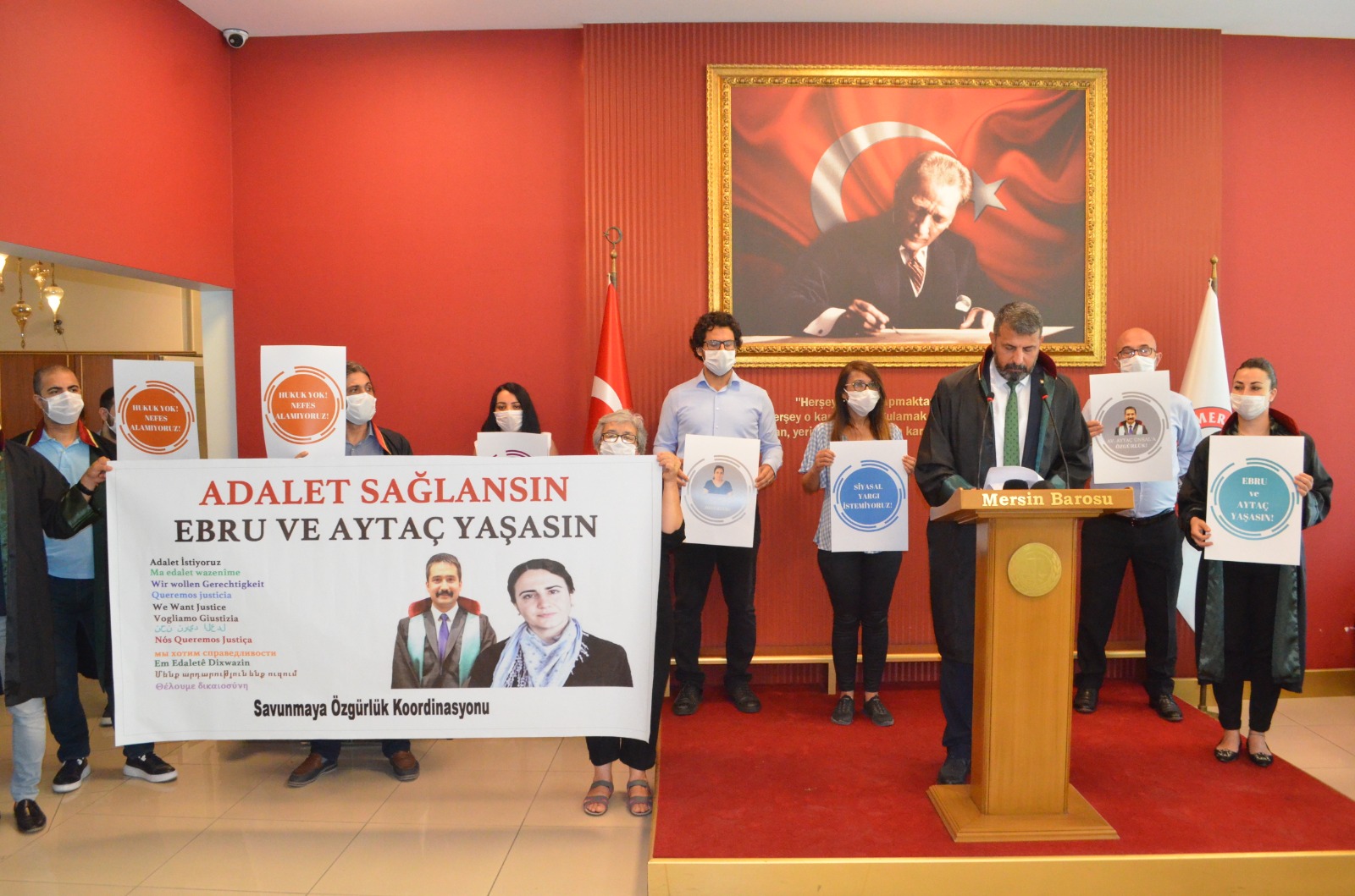 Mersin Barosu, avukatlar Ebru Timtik ve Aytaç Durmaz için baro binasında açıklama yaptı. Onlarca avukatın yer aldığı açıklamayı baro başkanı avukat Bilgin Yeşilboğaz okudu.