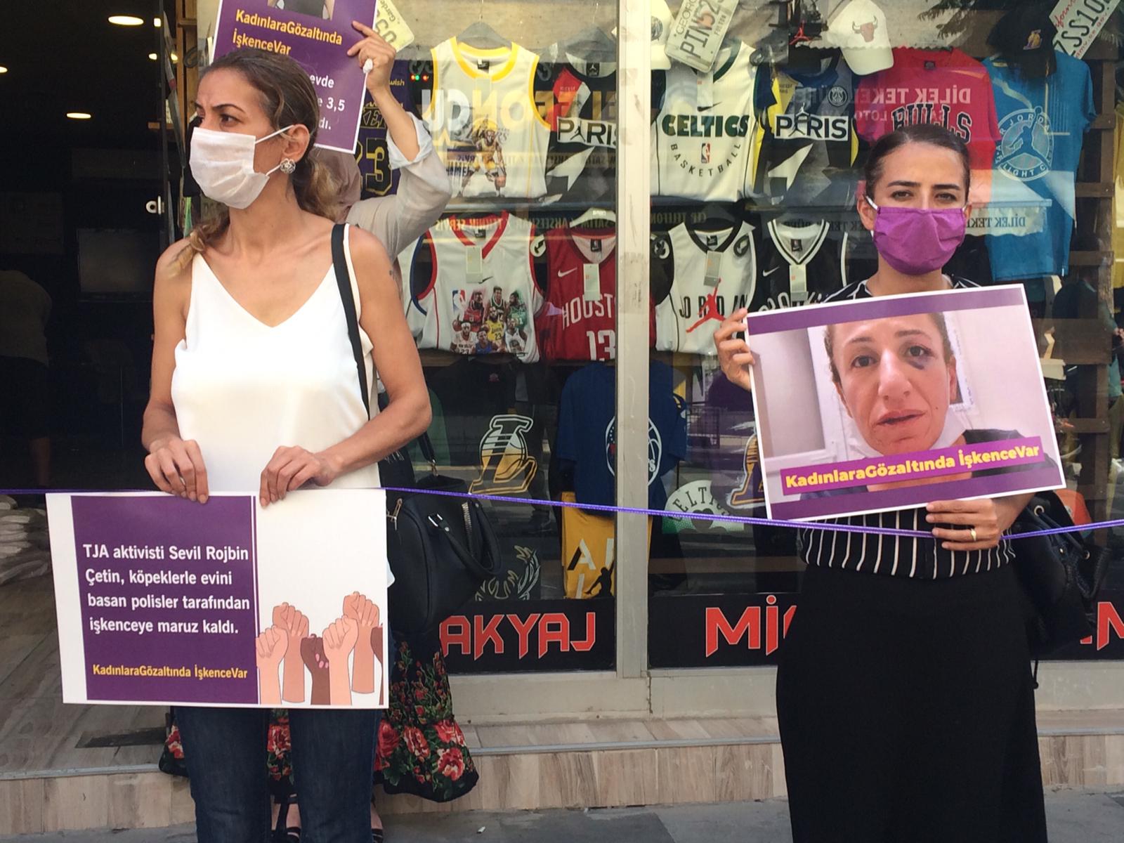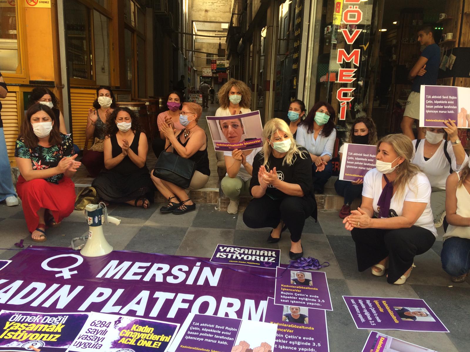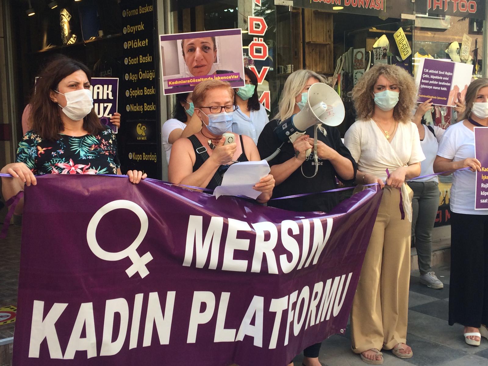 Mersin Kadın Platformu üyeleri, Halkların Demokratik Partisi (HDP) Mersin İl Örgütü binası önünde yaptıkları basın açıklamasıyla HDP Demokratik Yerel Yönetimler Kurulu üyesi Sevil Rojbin Çetin’e dönük köpekli işkenceyi protesto etti.