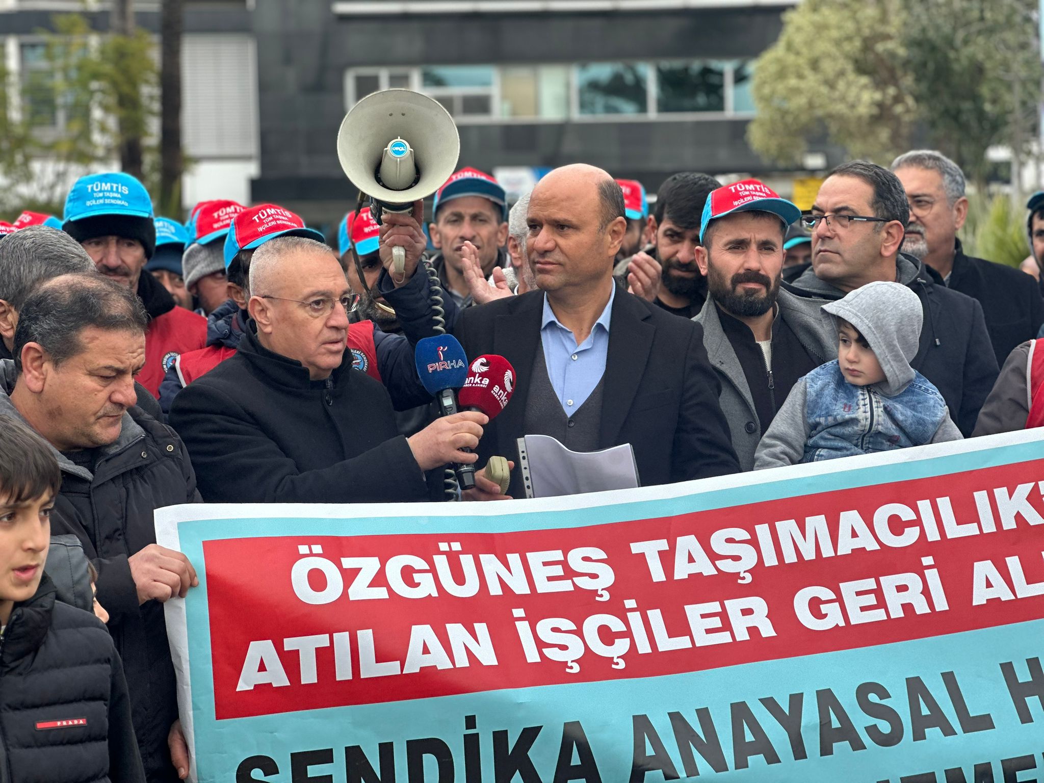 Basın açıklamasında konuşan TÜMTİS Mersin Şube Başkanı Savaş Gürkan, 22 gündür işe alınmalara dair direniş başlattıklarına vurgu yaparak, “Özgüneş Taşımacılık ve asıl işveren MIP işvereni, işçileri hiçbir alacaklarını ödemeden kapı önüne koymuştur. Bu yalnızca işçileri değil, onların ailelerini de açlığa mahkum etmek demektir. Yıllarca emek veren işçiye reva görülen muamele budur. Bu tutum, işverenin kârdan başka hiçbir şey düşünmediğinin açık göstergesidir” dedi.