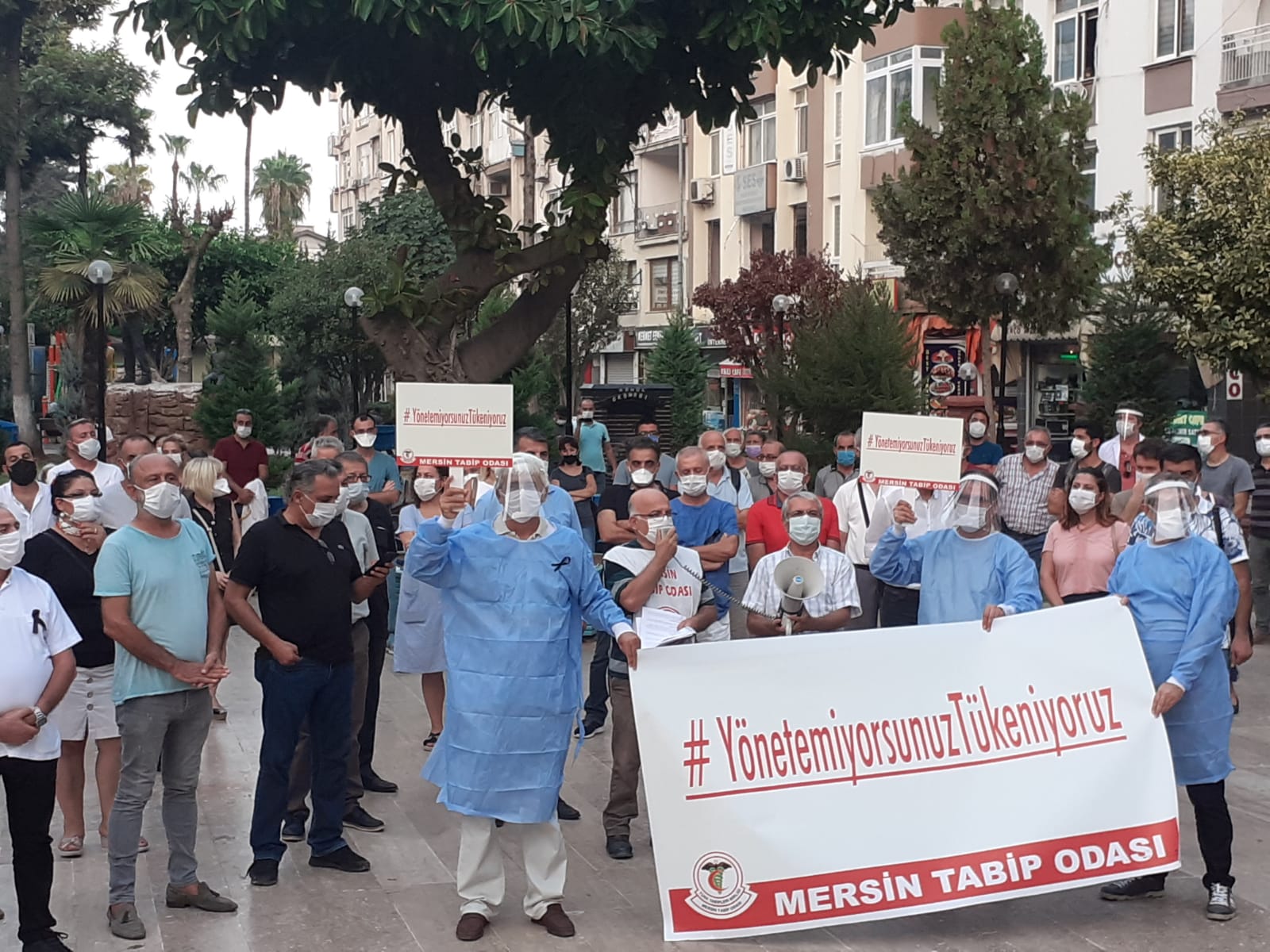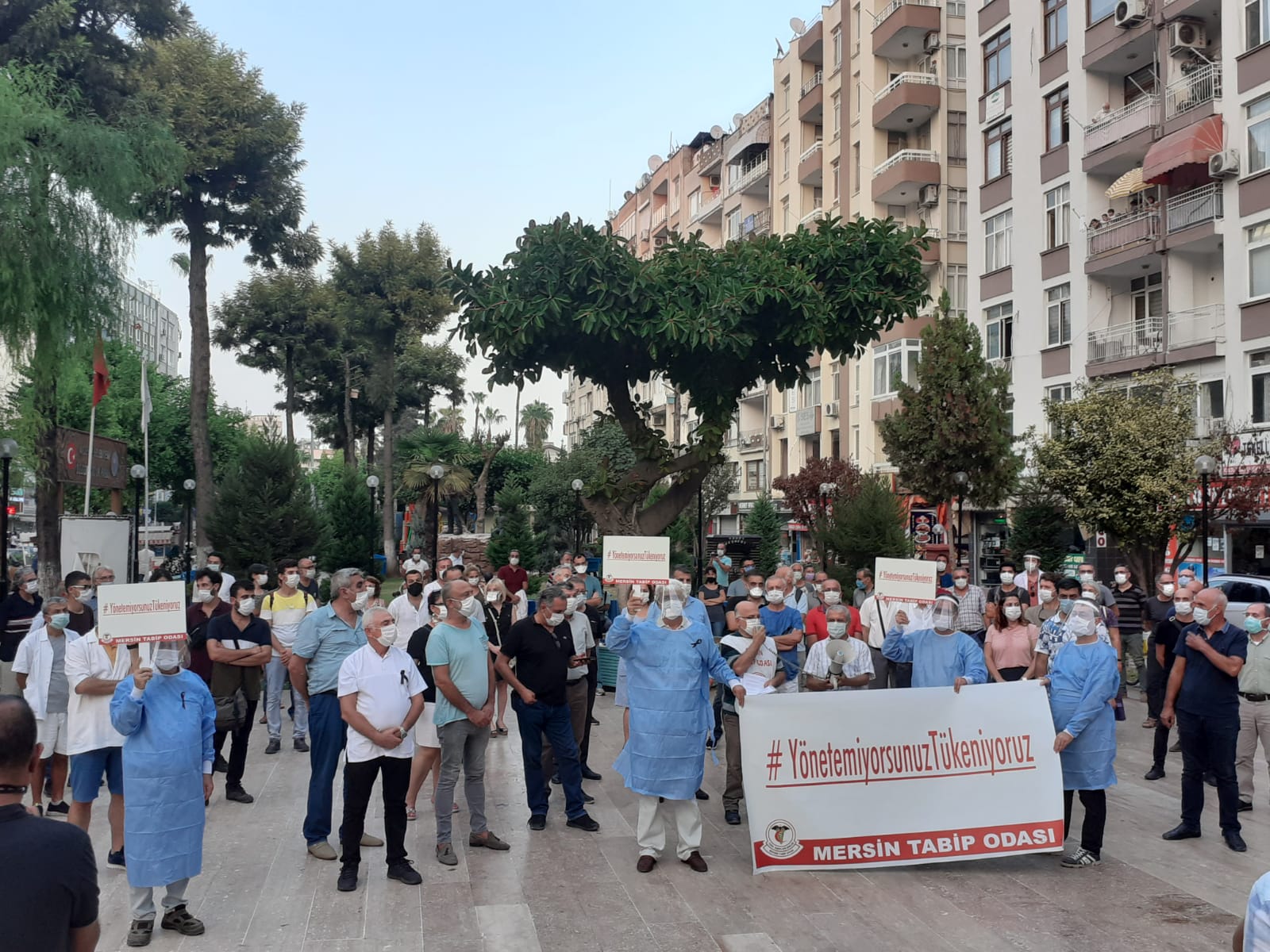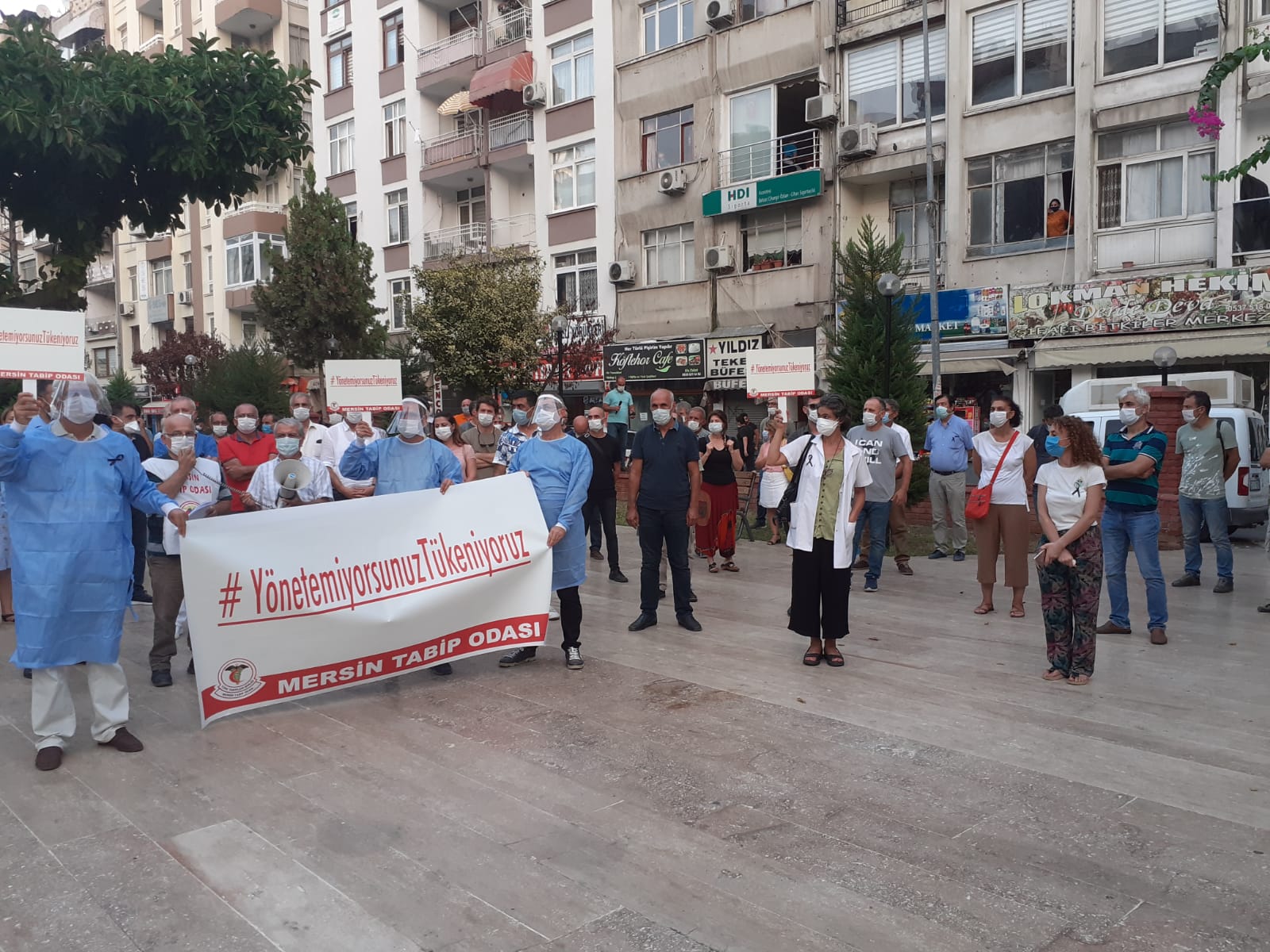 Mersin Tabip Odası da koronavirüs pandemisinden dolayı yaşamını yitiren sağlıkçılara dikkat çekmek için basın açıklaması yaptı. Özgür Çocuk Parkı’nda yapılan açıklamada “Yönetemiyorsunuz, tükeniyoruz” pankartı açıldı. Açıklamaya kentte bulunan çeşitli siyasi parti ve sivil toplum örgütü temsilcileri katıldı.