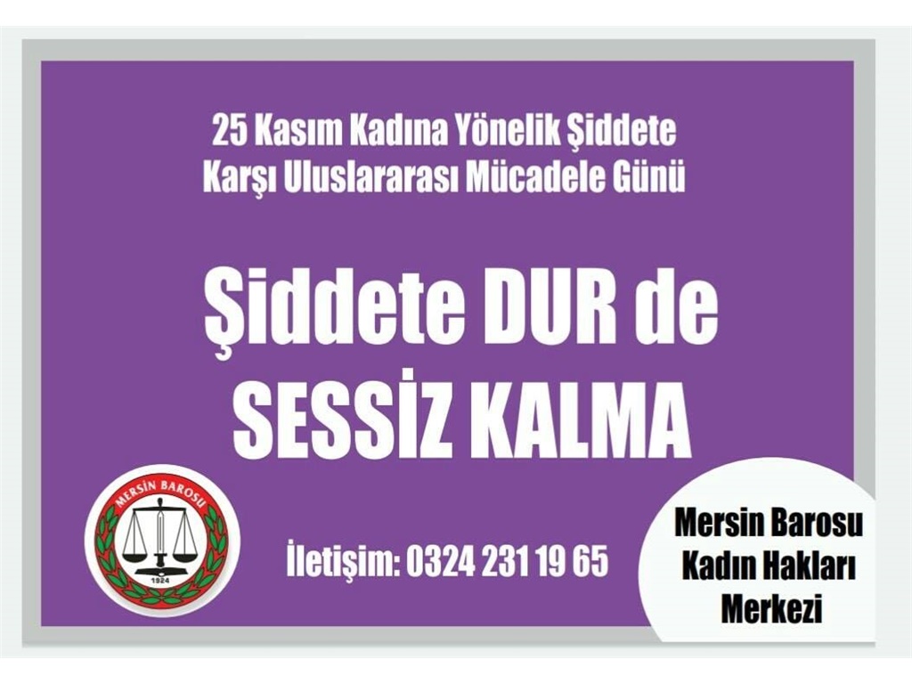 Mersin ve Adana Barosu Kadın Hakları Merkezi, Kadına Yönelik Şiddetin Ortadan Kaldırılması için Uluslararası Mücadele Günü nedeniyle yazılı açıklama yaptı.