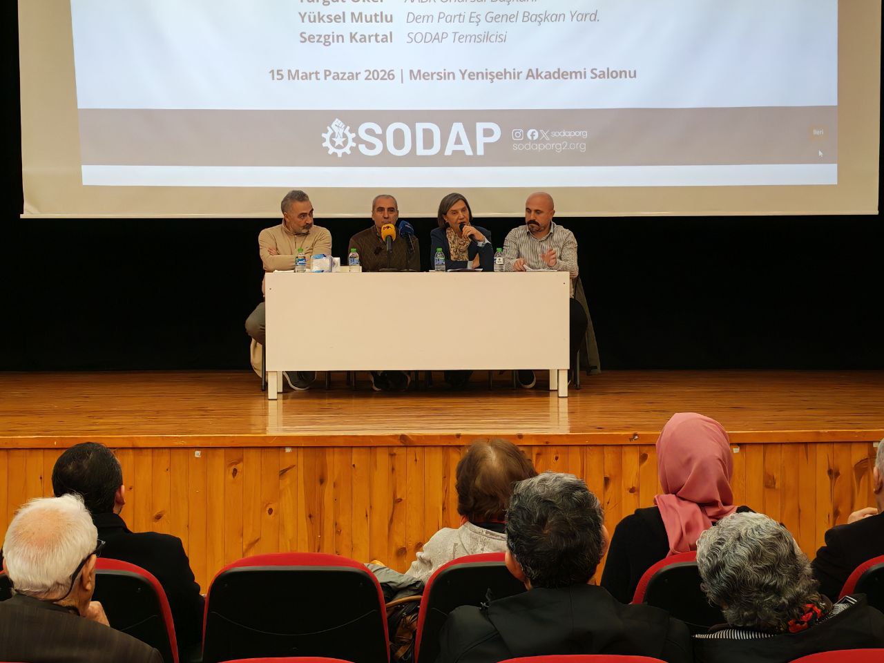 Sosyalist Dayanışma Platformu (SODAP), “Soykırımın 1’nci yılında Aleviler ve Ortadoğu” başlığıyla panel düzenledi. Mersin Yenişehir Belediyesi Akademi Salonu’nda gerçekleşen panelde konuşmacı olarak Halkların Eşitlik ve Demokrasi Partisi (DEM Parti) Eş Genel Başkan Yardımcısı Yüksel Mutlu, Alman Alevi Birlikleri Federasyonu (AABF) Onursal Başkanı Turgut Öker ve SODAP Temsilcisi Sezgin Kartal katıldı.