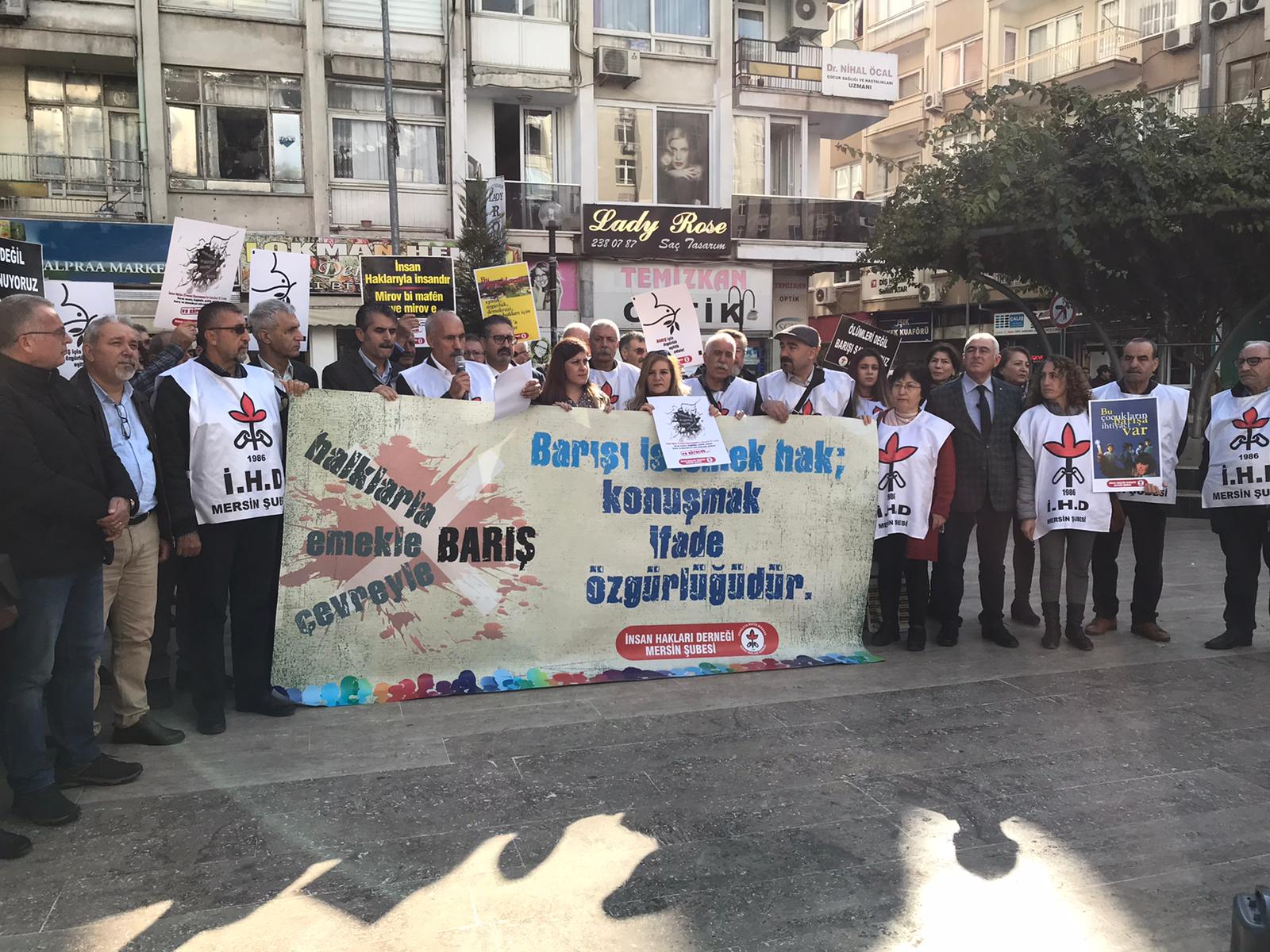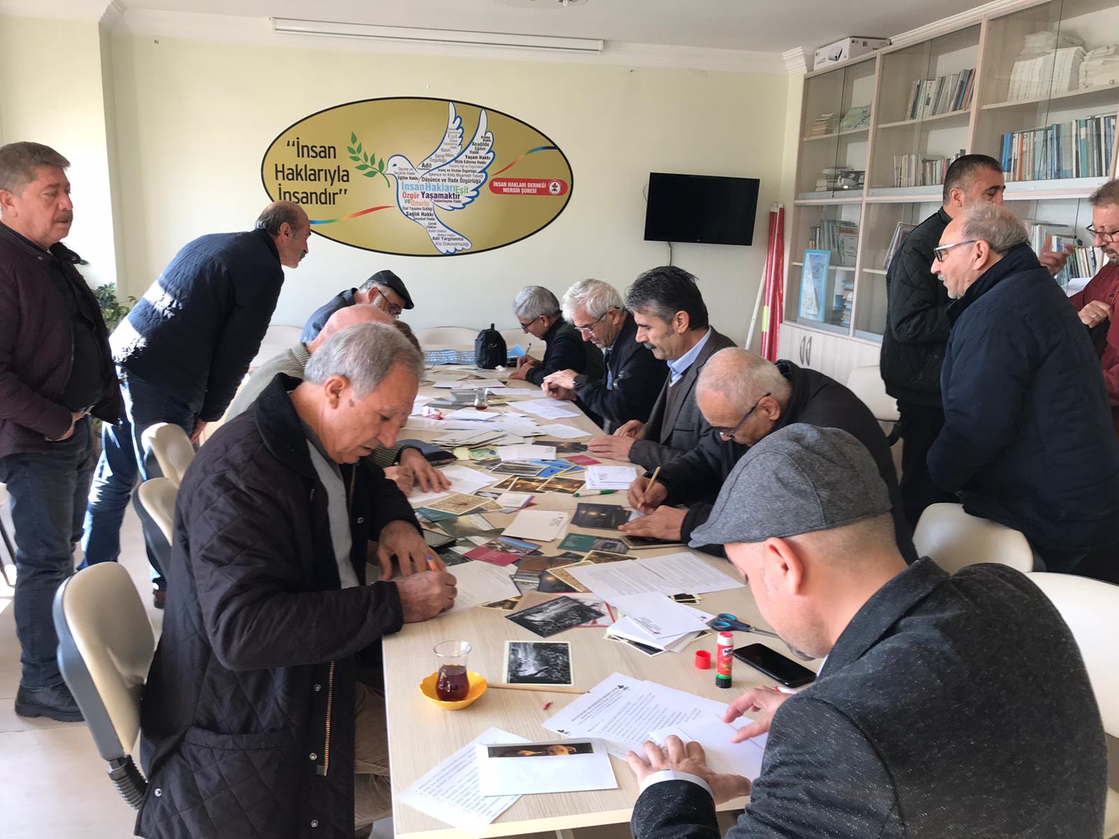 İHD binasında bir araya gelen kurum temsilcileri ve yurttaşlar cezaevlerine yeni yıl kartı yazdı. Ardından PTT Mersin şubesi önünde basın açıklaması yapıldı. Basın açıklamasını okuyan İHD şube başkanı Hakkı Demir, “Bu yıl da İnsan Hakları Evrensel Bildirgesi’nde belirtildiği gibi barış, adalet, eşitlik, özgürlük ve insan onurunun korunmasını ve bunları güvence altına alacak demokrasi mücadelesi verilmesini savunmaya devam ediyoruz” diyerek şunları belirtti;