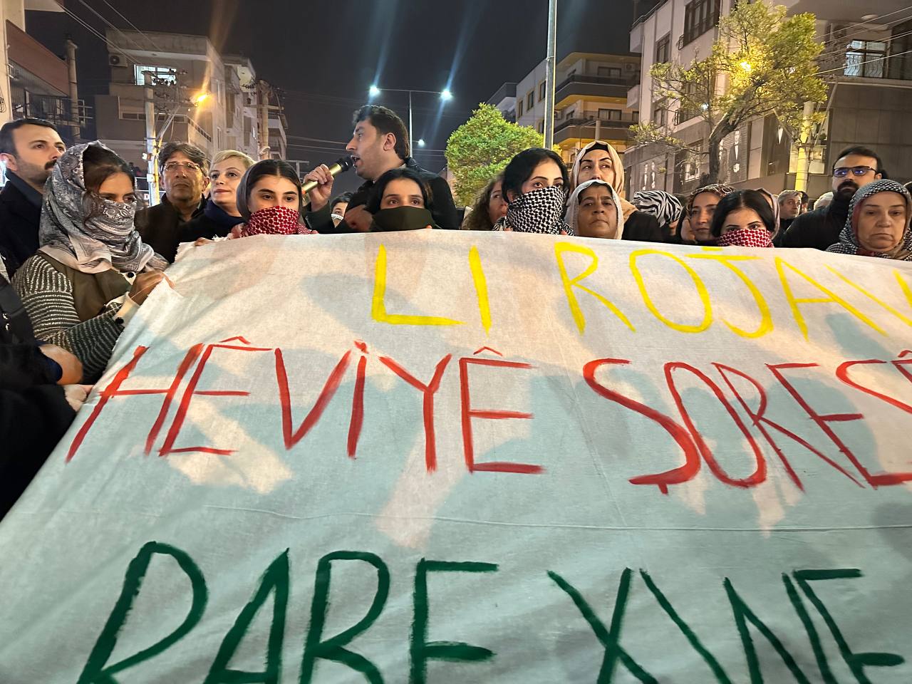 Şevket Sümer Mahallesinde bulanan Barış Parkından DEM Parti Akdeniz ilçe binası önüne kadar yürüyen kitle sık sık “Rojava halkı yalnız değildir” sloganları attı.