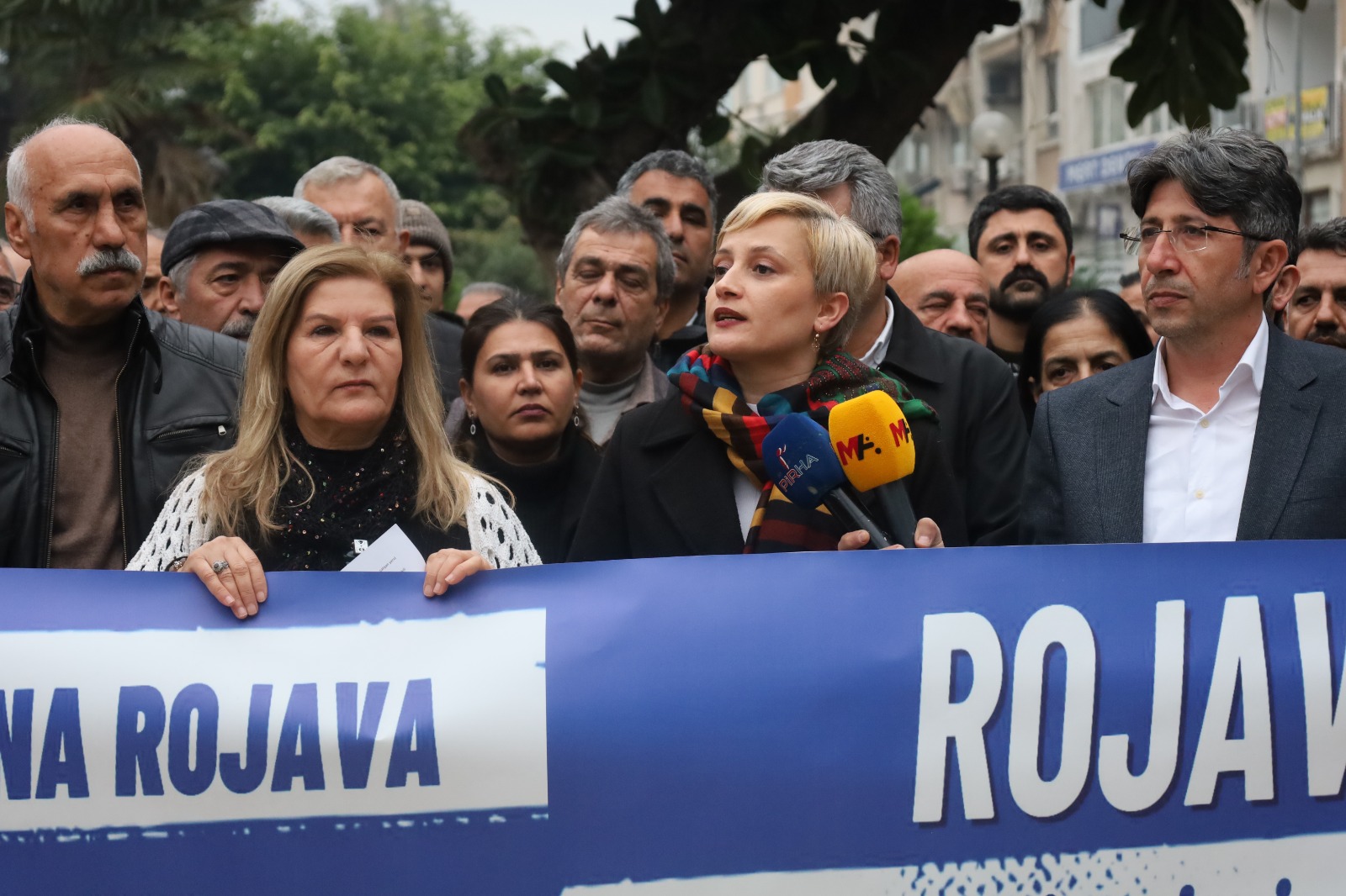 Burada ilk olarak konuşan Halkların Eşitlik ve Demokrasi Partisi (DEM Parti) Mersin Milletvekili Perihan Koca, Halep’te Kürt ve Süryani mahallelerinde sivil halkı hedef alan saldırıların sürdüğüne dikkat çekerek, söz konusu saldırıların bugüne özgü ya da münferit olmadığını söyledi. Geçmişten bu yana süregelen bir saldırı hattının devamı olduğunu vurgulayan Perihan Koca, “Geçtiğimiz yıl 8 Aralık 2024 tarihleri itibarıyla Suriye’de oluşan yeni inşa süreciyle beraber, HTŞ’nin, yani IŞİD artığı olan cihatçı çetelerin Alevi halkına yönelik katliamlarla, Dürzi halkına yönelik katliamlarla, Hristiyan halkına yönelik katliamlarla devam ettirdiği kıyım pratiği bugün Kürt halkıyla devam ediyor. Bizler bugün buradan bir kez daha ifade ediyoruz: Bu saldırıları kabul etmiyoruz. Suriye halklarına kandan, katliamdan, savaştan, soykırım politikalarından başka bir şey vadetmeyen bu kaosu kabul etmiyoruz” dedi.