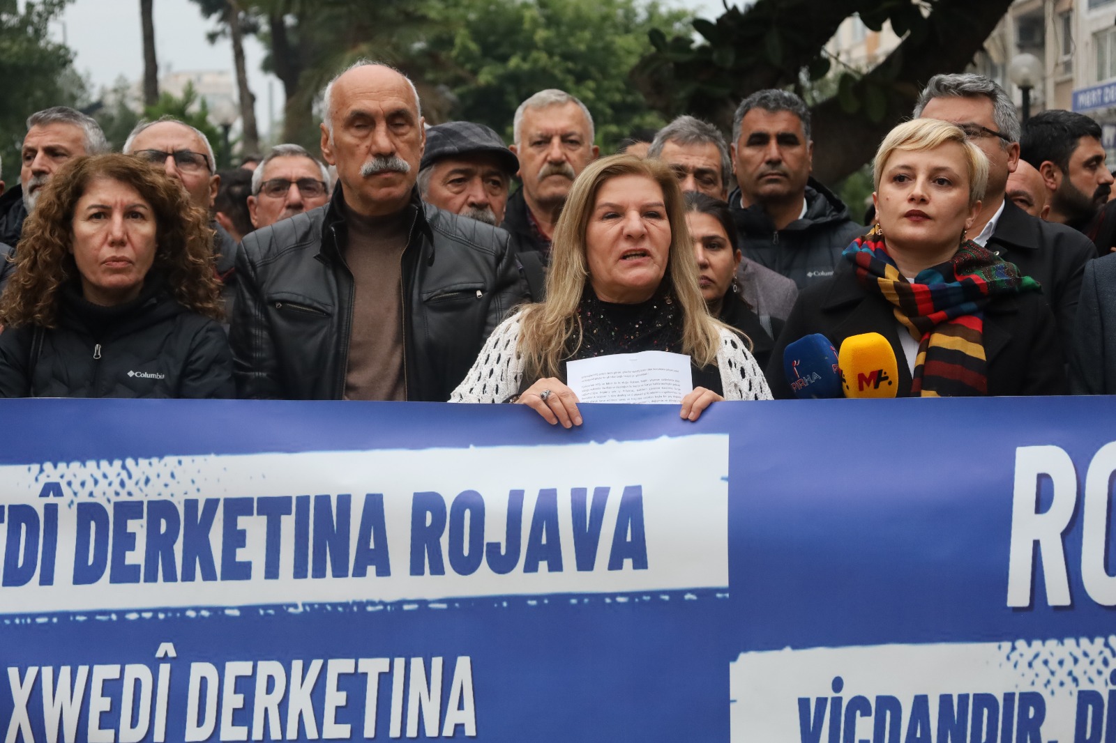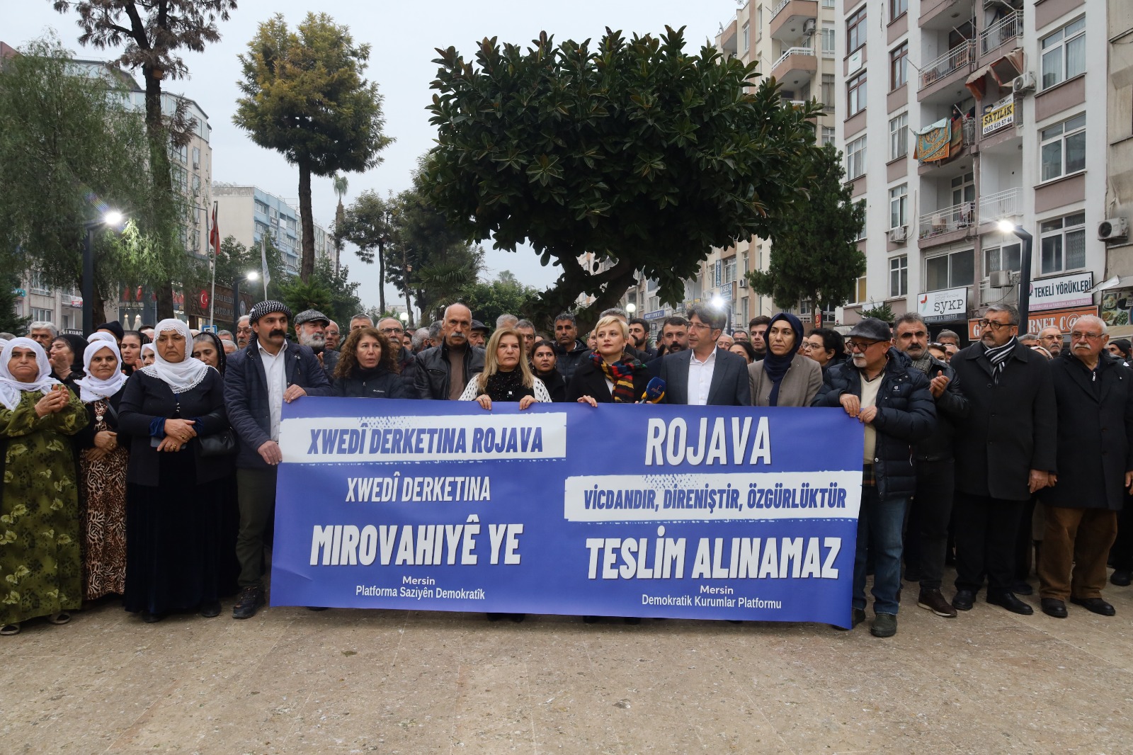 Mersin Demokratik Kurumlar Platformu, Halep’te Kürtlerin yoğun olarak yaşadığı Şêxmeqsûd ve Eşrefiye mahallelerine yönelik HTŞ saldırılarına ilişkin Özgür Çocuk Parkında basin açıklaması yaptı. Açıklamaya DEM Parti Mersin Milletvekilleri Perihan Koca ile Ali Bozan, Barış Anneleri, İnsan Hakları Derneği ve çok sayıda kurum temsilcisi katıldı. “Rojava vicdandır, direniştir, özgürlüktür teslim alınamaz” yazılı pankartın açıldığı eylemde “Rojava halkı yalnız değildir” sloganları atıldı. Basın metnini platform adına DEM Parti Mersin İl Eş Başkanı Bedriye Kuş okudu.