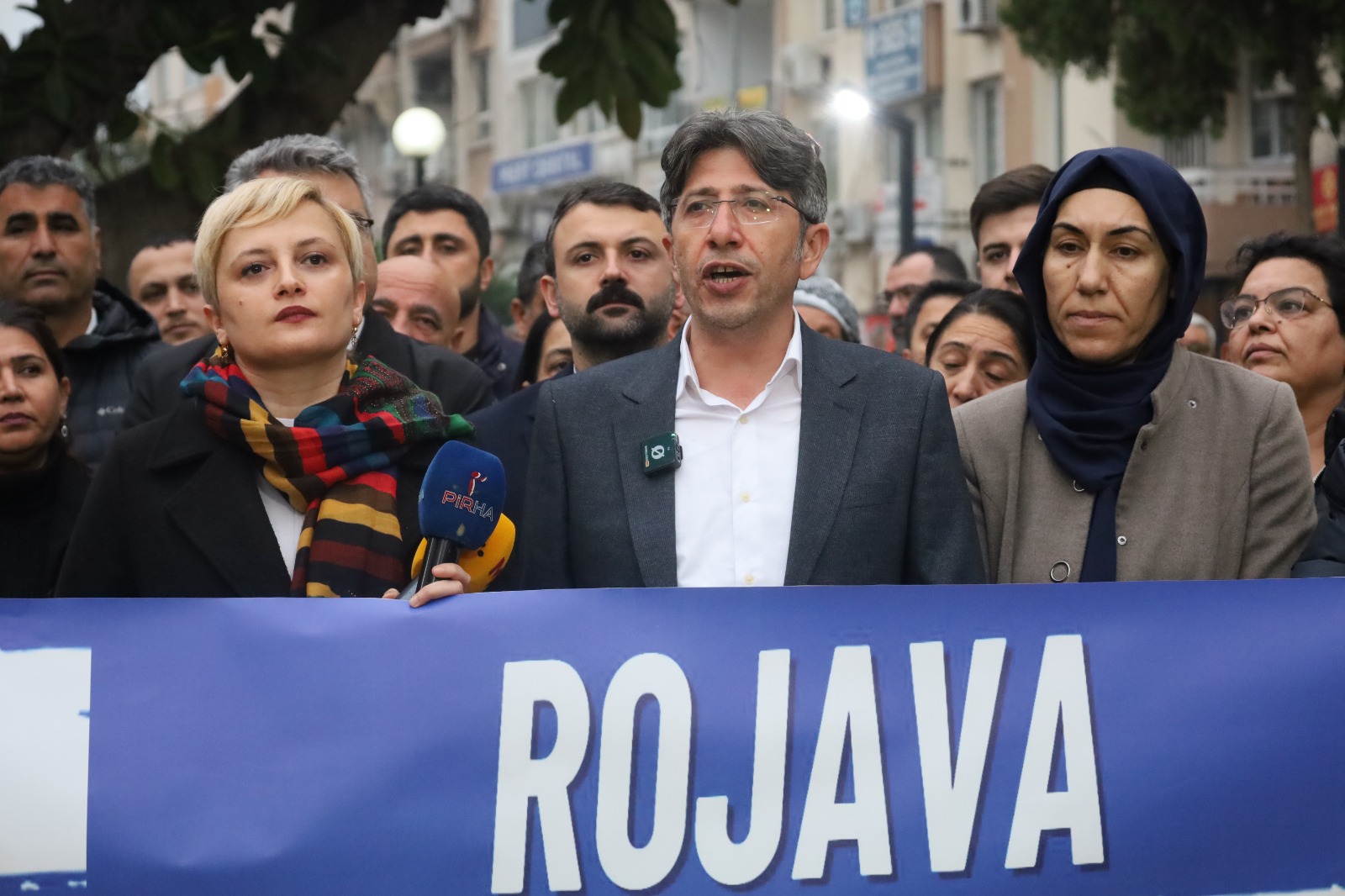 Son olarak söz alan DEM Parti Mersin Milletvekili Ali Bozan, hükümeti eleştirerek şunları söyledi: “Ankara’da oturup Suriye için ‘Suriye’nin toprak bütünlüğü’ diyenlere, Suriye için ‘tek millet, tek devlet, tek ordu’ diyenlere sesleniyoruz. Daha üç gün önce sizin şahitliğinizde Paris’te yapılan görüşmelerde Suriye’nin güneyi İsrail’e teslim edildi. İsrail’e söyleyecek sözünüz yok mu? İsrail’e Suriye’nin güneyi teslim edilirken Suriye’nin toprak bütünlüğü bozulmuyor mu? Halep’te Kürt’e ölüm varken Mersin’deki, Van’daki, İstanbul’daki, Amed’deki Kürt’le kardeşlik olur mu? Artık bir karar verin. Kürtler gerçekten sizin kardeşiniz mi? Yoksa Kürtlere saldıranlar, kazanımlarına saldıranlar, Kürtleri katledenler IŞİD artığı çeteler olsa dahi onları mı destekleyeceksiniz? Barış diyen, kardeşlik diyen, çözüm diyen Kürtleri mi istiyorsunuz, yoksa IŞİD artığı çeteleri mi istiyorsunuz? Bizler Kürtler ve dostları olarak Halep’te Kürtlere yönelik saldırılar durduruluncaya kadar sokakta olacağız, alanda olacağız. Halep’te yaşayan Kürtleri yalnız bırakmayacağız, yalnız bırakmayalım.”