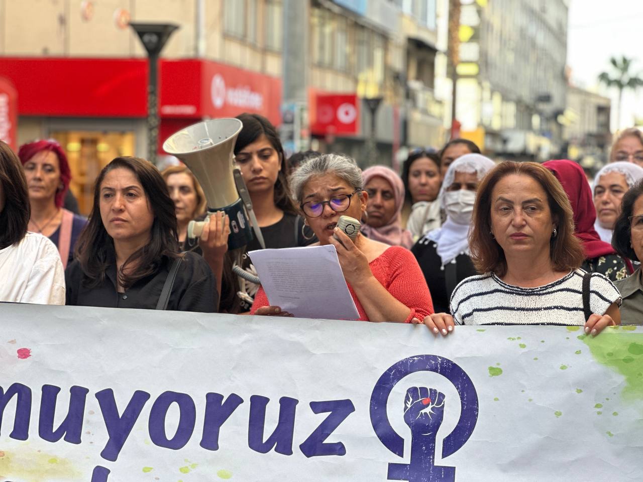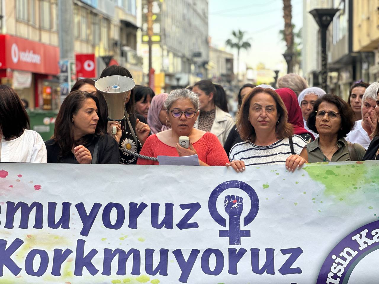 “Henüz geçtiğimiz günlerde Tarsus’ta yaşanan hamile bir kadının sokak ortasında katledilmesini unutmadık. Töre adı altında, namus adı altında katledilen Besra, kendi abisi ve amcası tarafından planlanarak katledildi. Nedeni ise sadece kendi istediği evliliği yapmasıydı. Kadınları malı, ‘namusu’, evinin bir eşyası gibi gören bu ataerkil düzen ve onu besleyen, katliamları teşvik eden bu iktidarın karşısında örgütlü mücadelemizle ve öz savunmamızla varız. Nefretin, savaşın, homofobi ve transfobinin, eşitsizliğin kol gezdiği bu topraklarda gücümüzü birlikteliğimizden, mücadelemizden alıyoruz, almaya da devam edeceğiz.“