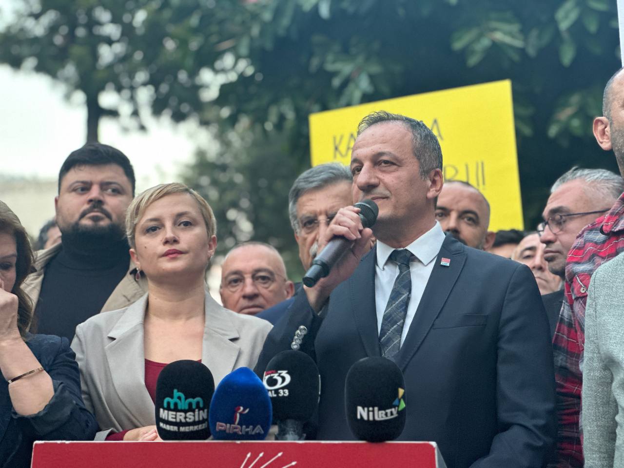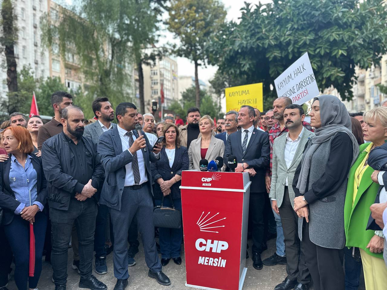 PİRHA- CHP Mersin İl Başkanlığı, Esenyurt Belediye Başkanı Ahmet Özer’in tutuklanması ve belediyeye kayyım atanmasına karşı eylem yaptı. Eylemde yapılan açıklamada, “Esenyurtluların oyuyla seçilen belediye başkanımızı hedef alarak, halkın iradesini yok sayan bu kararı kendi çıkarlarına göre, hukuk dışı süreçler işletmesini asla kabul etmiyoruz” denildi.