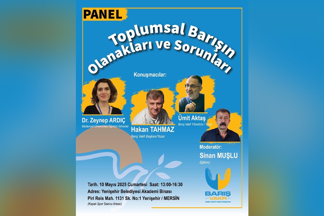 Barış Vakfı, toplumsal barışın güncel koşulları ve önündeki engelleri konuşmak amacıyla 10 Mayıs Cumartesi günü Mersin’de panel düzenleyecek. “Toplumsal Barışın Olanakları ve Sorunları” konululu panel, Yenişehir Belediyesi Akademi Salonu’nda saat 13.00’te başlayacak.