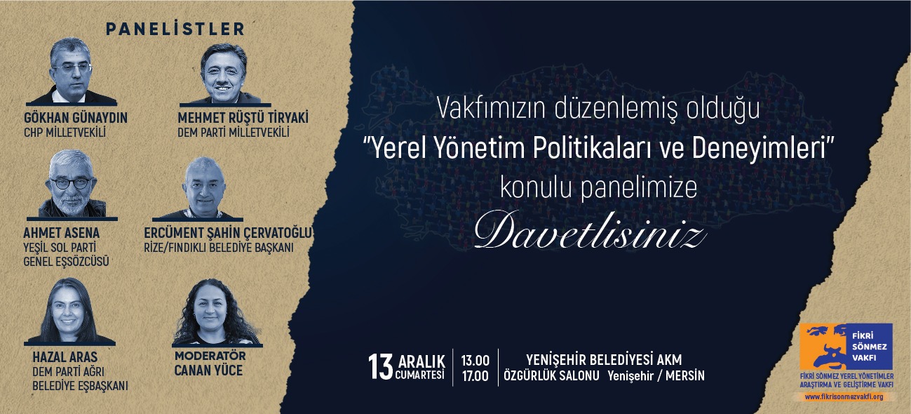 13 Aralık Cumartesi günü saat 13.00’de Yenişehir Belediyesi Atatürk Kültür Merkezi’nde yapılacak panele CHP Milletvekili Gökhan Günaydın, DEM Parti Milletveikili RÜştü Tiryaki, Yeşil Sol Parti Genel Eş Sözcüsü Ahmet Asena, Fındıklı Belediye Başkanı Ercüment Şahin Çervatoğlu, Ağrı Belediye Eş Başkanı Hazal Aras katılacak.