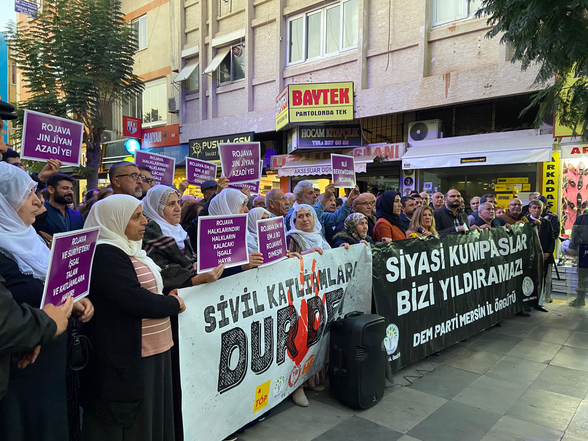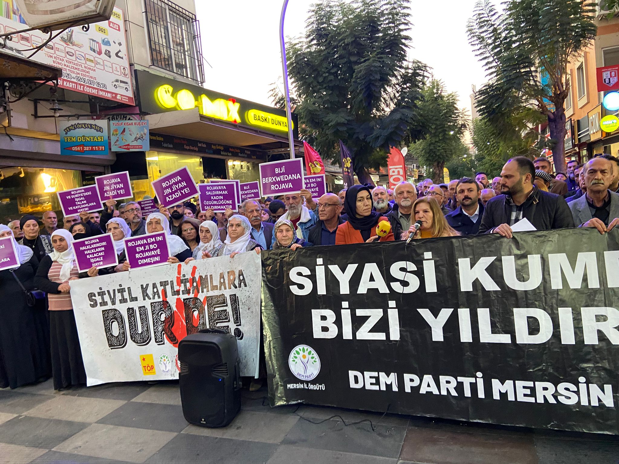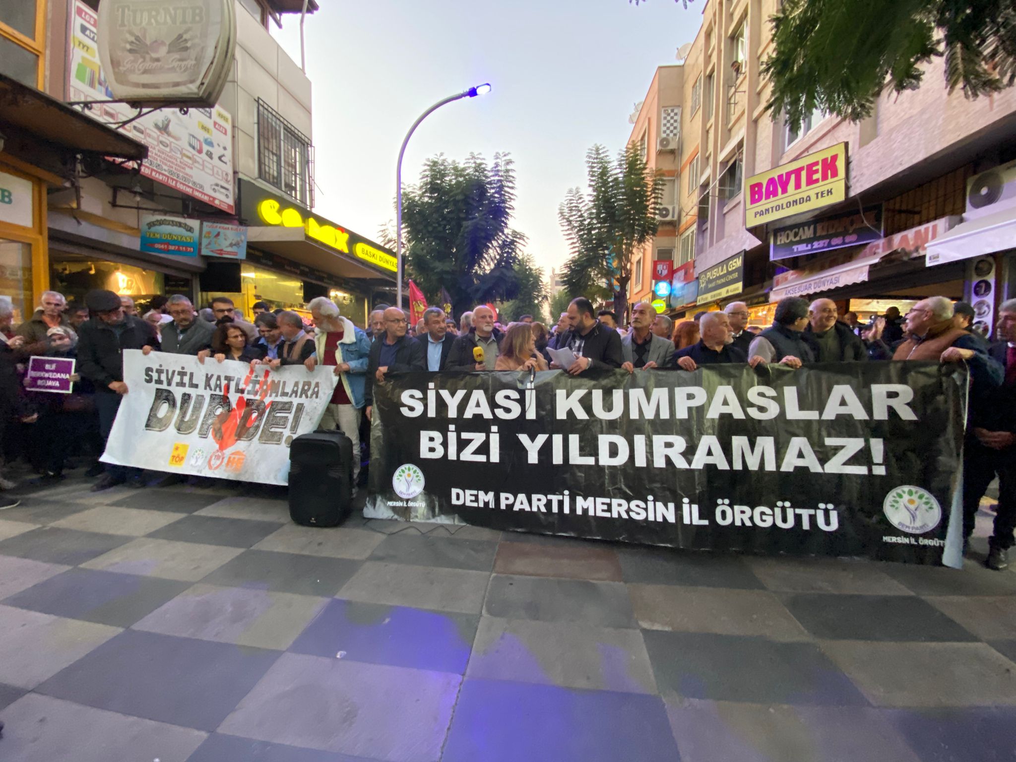 DEM Parti Mersin İl Örgütü, saldırılara ilişkin il binası önünde basın açıklaması gerçekleştirdi. Açıklamaya, Emek Partisi (EMEP) ve Türkiye İşçi Partisi (TİP) ile Mersin Halkevleri yöneticileri ve çok sayıda yurttaş katıldı.
