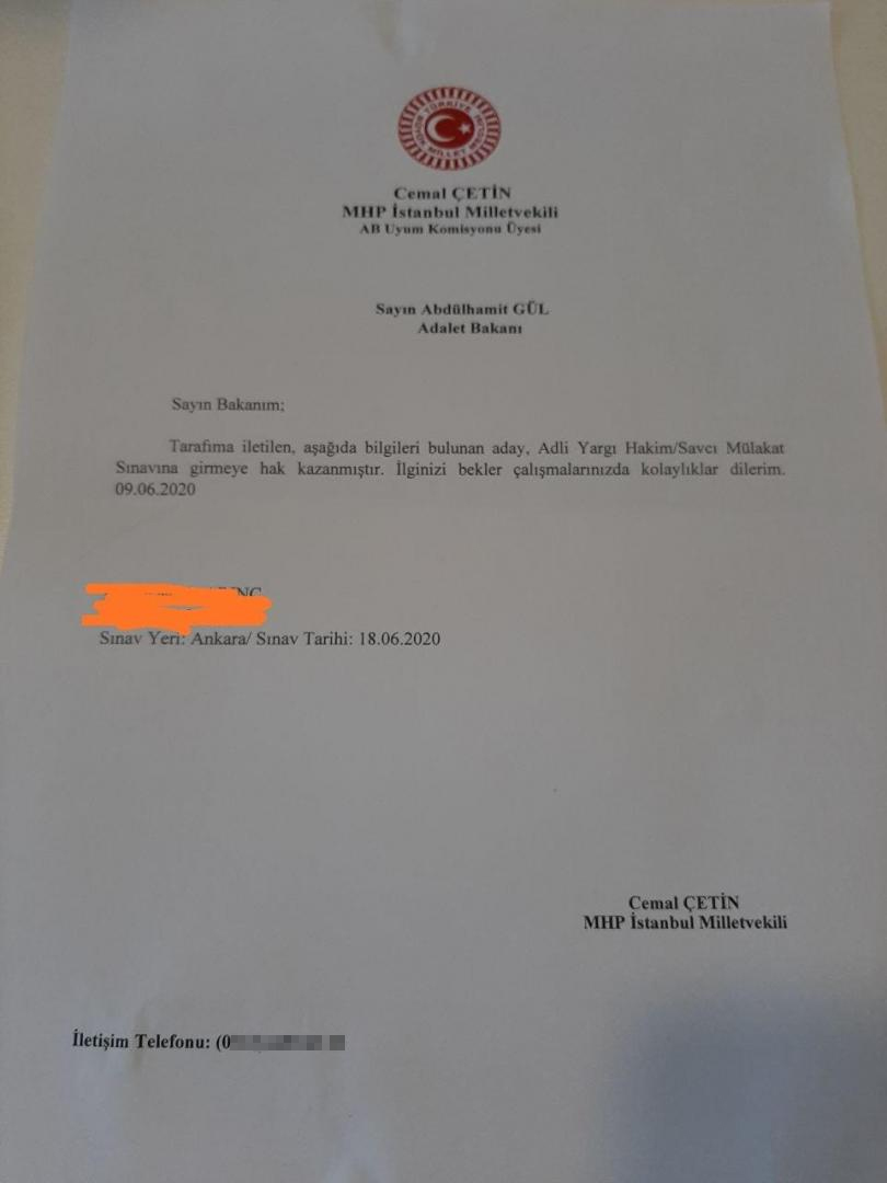 AKP – MHP ittifakının liyakat anlayışının yanlışlıkla gün yüzüne çıkmasını sağlayan MHP İstanbul Milletvekili Cemal Çetin, Adalet Bakanı Abdülhamit Gül’e, 9 Haziran’da yazdığı iddia edilen metinde, “Sayın Bakanım, tarafıma iletilen, aşağıda bilgileri bulunan aday, Adli Yargı Hakim/Savcı Mülakat Sınavına girmeye hak kazanmıştır. İlginizi bekler çalışmalarınızda kolaylıklar dilerim” dedi.