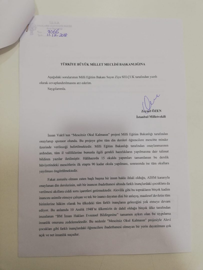 Halkların Demokratik Partisi İstanbul Milletvekili Zeynel Özen, “Mescitsiz Okul Kalmasın” projesinin Milli Eğitim Bakanlığı tarafından onaylanmasını Bakan Ziya Selçuk’a sormuştu.