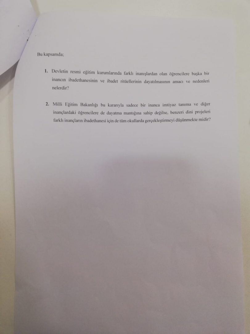 - Milli Eğitim Bakanlığı bu kararıyla sadece bir inanca imtiyaz tanıma ve diğer inançlardaki öğrencilere de dayatma mantığına sahip değilse, benzeri dini projeleri farklı inançların ibadethanesi için de tüm okullarda gerçekleştirmeyi düşünmekte midir?